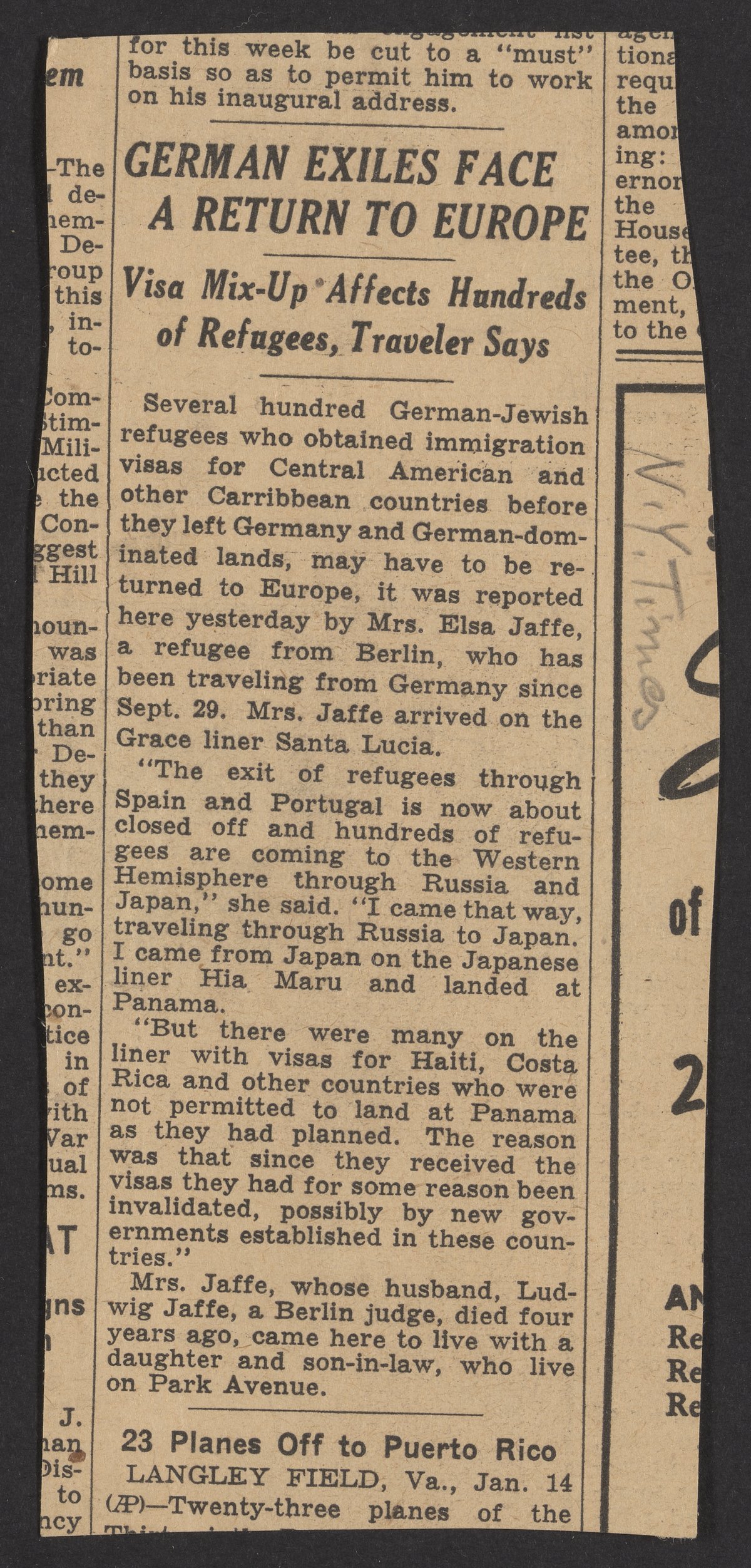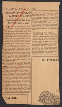 New York Times article titled German Exiles Face a Return to Europe: Visa Mix-Up Affects Hundreds of Refugees, Traveler Says. The article interviews Mrs. Elsa Jaffe who says the immigrating through Spain and Portugal is soon to be closed off.