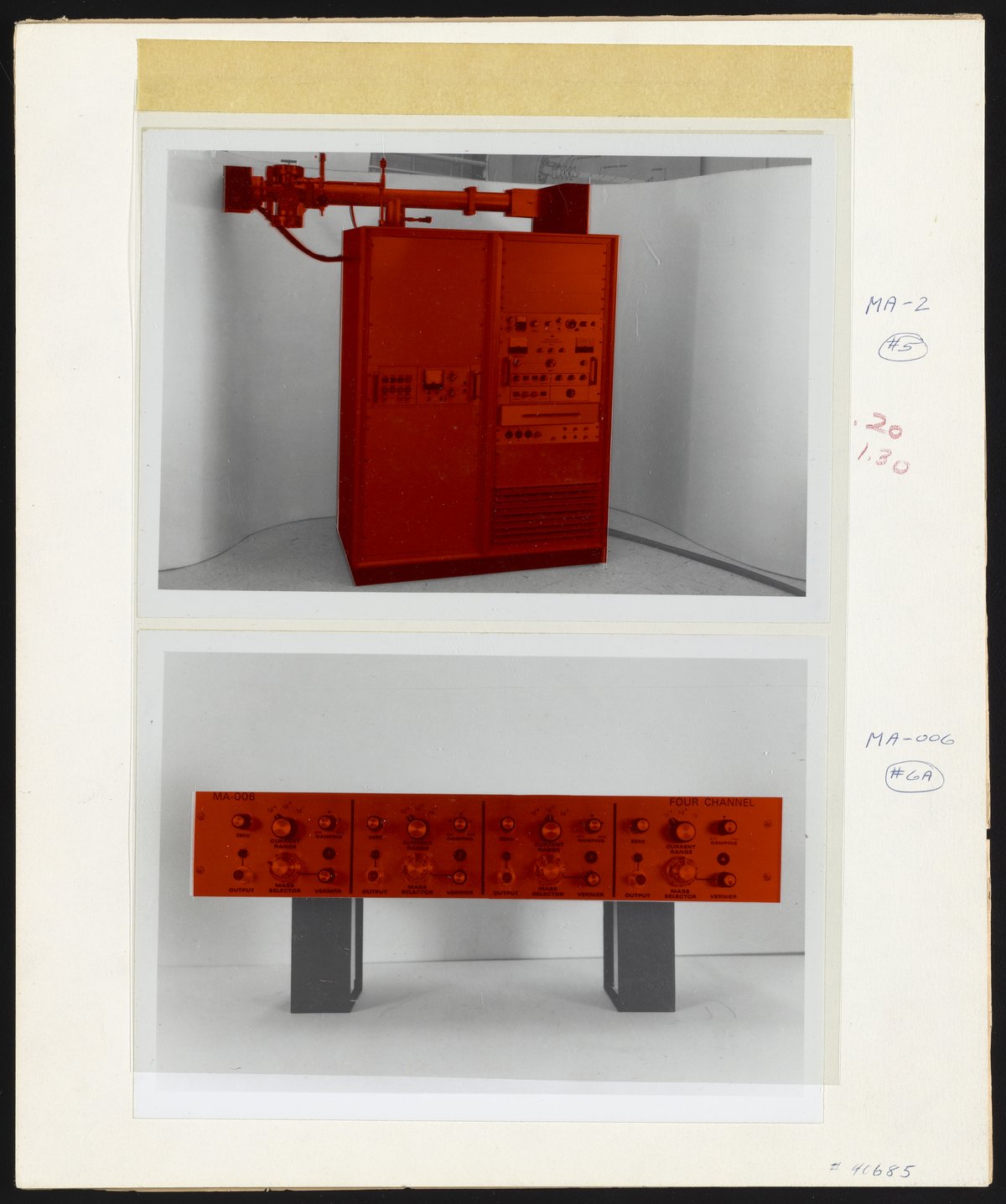 Overlaid printer's proof depicting a Bendix Corporation MA-2 Time-of-Flight Mass Spectrometer and Model MA-006 Four Channel Monitor. The Time-of-Flight Mass Spectrometer (TOFMS) was the flagship instrument of the Bendix Corporation.