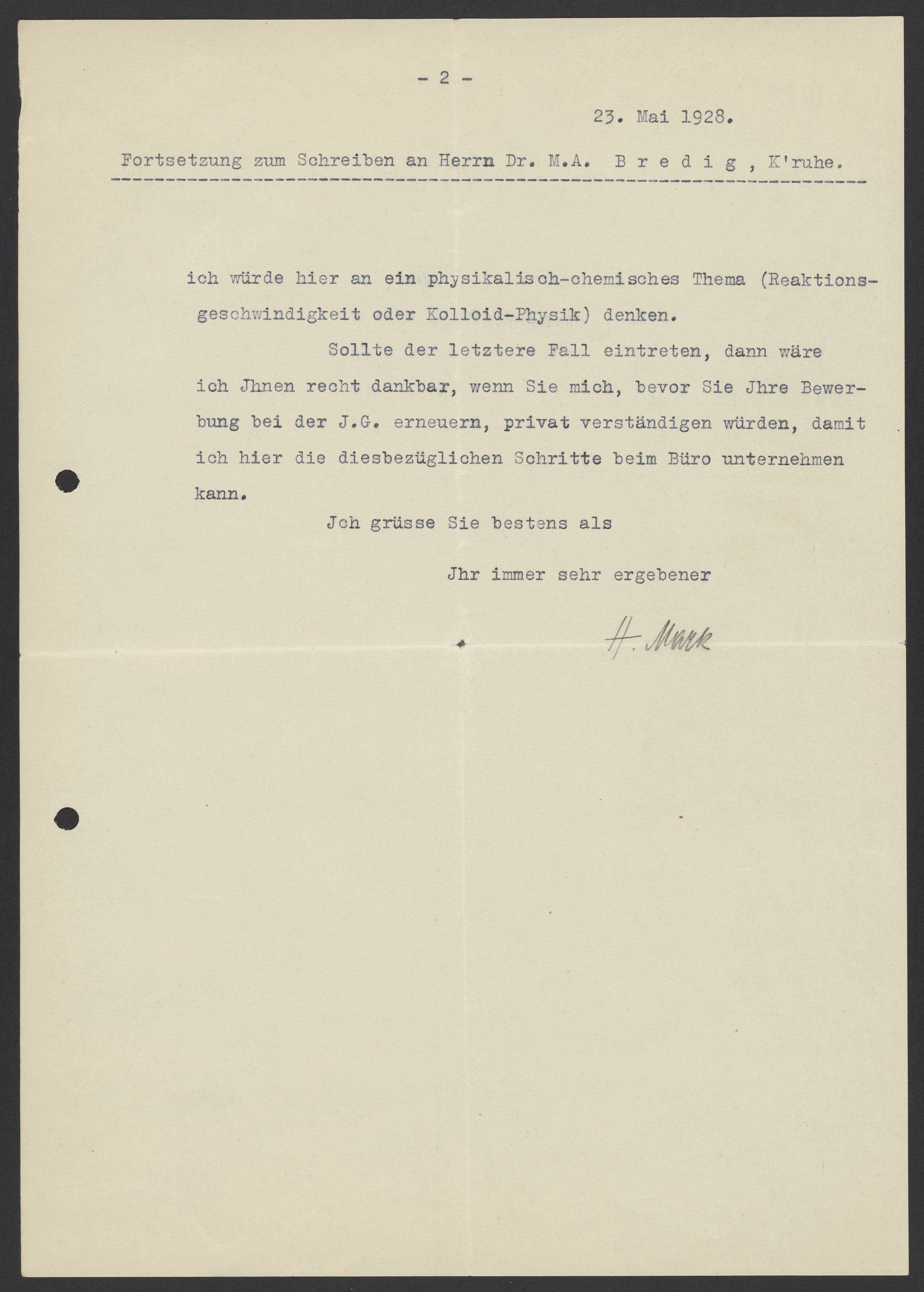Small JPG1200 x 1682px — 262 KBLarge JPG2880 x 4037px — 1.4 MBFull-sized JPG5240 x 7346px — 4.4 MBOriginal fileTIFF — 5240 x 7346px — 110 MBHerman Francis Mark (1895-1992), an Austrian chemist known for his contributions to polymer science, X-ray diffraction, and his work at IG Farben, describes a position that he would like to offer Max Bredig (1902-1977) in his laboratory.
