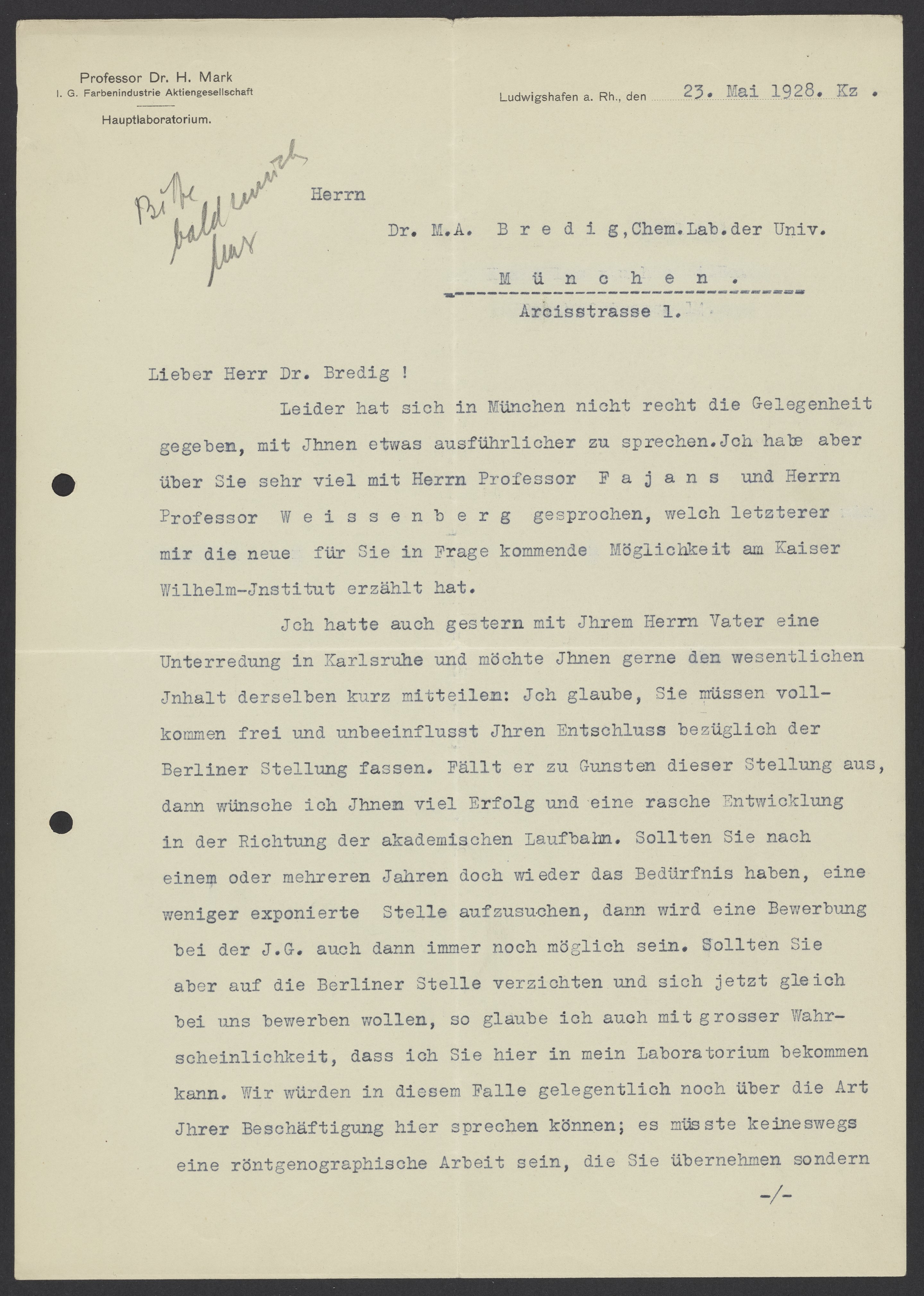 Ich hatte auch gestern mit Ihrem Herrn Vater eine Unterredung in Karlsruhe und möchte Ihnen gerne den wesentlichen Inhalt derselben kurz mitteilen: Ich glaube, Sie müssen vollkommen frei und unbeeinflusst Ihren Entschluss bezüglich der Berlin Stellung fassen. Fällt er zu Gunsten dieser Stellung aus, dann wünsche ich Ihnen viel Erfolg und eine rasche Entwicklung in der Richtung der akademischen Laufbahn. Sollte Sie nach einem oder mehreren Jahren doch wieder das Bedürfnis haben, eine weniger exponierte Stelle aufzusuchen, dann wird eine Bewerbung bei der I.G. auch dann immer noch möglich sein. Sollten Sie aber auf die Berliner Stelle verzichten und sich jetzt gleich bei uns bewerben wollen, so glaube ich auch mit grosser Wahrscheinlichkeit, dass ich Sie hier in mein Laboratorium bekommen kann. Wir würden in diesem Falle gelegentlich noch über die Art Ihrer Beschäftigung hier sprechen können; es müsste keineswegs eine röntgenographische Arbeit sein, die Sie übernehmen sondern