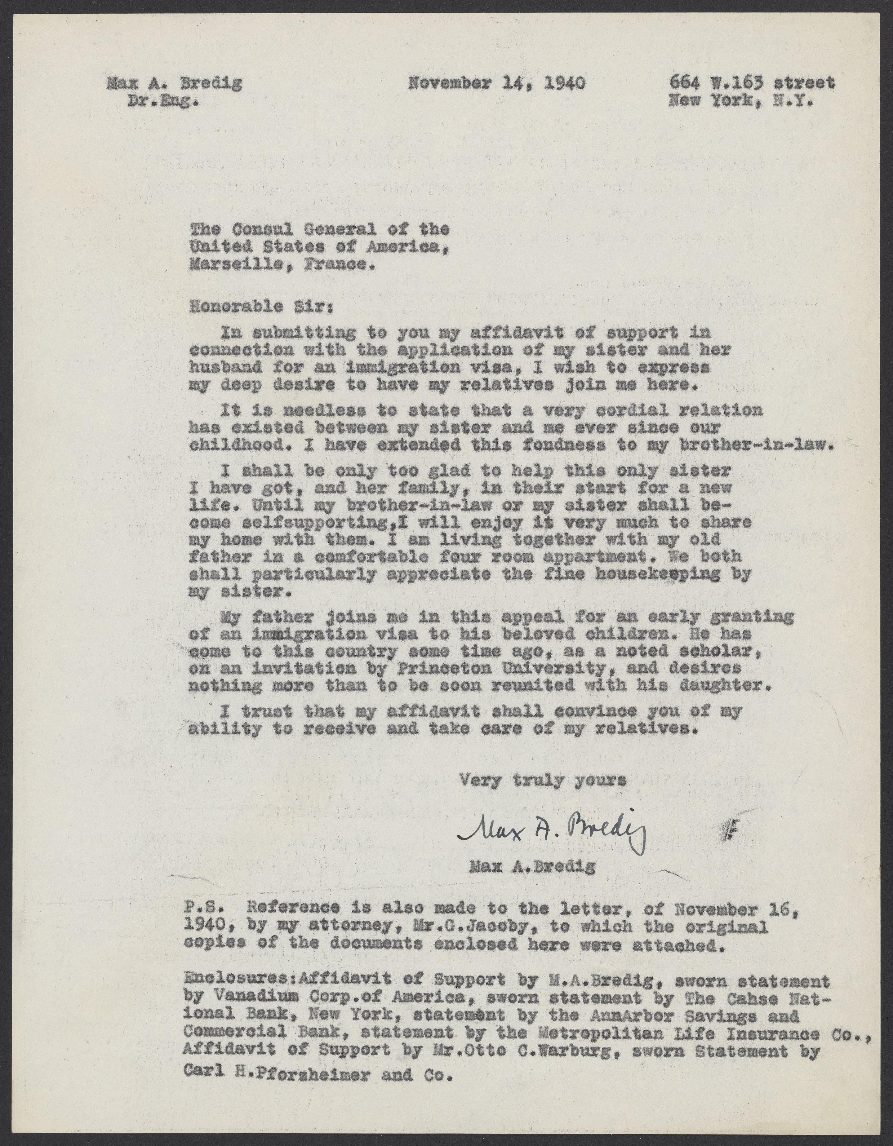 Max Bredig (1902-1977) writes to the American Consul General regarding his recent affidavit for his sister, Marianne (1903-1986), and her husband, Viktor Homburger (1888-1968). In the letter, he explains how close he is to his sister and how he would be happy to support her and her family when they come to the United States. He adds that their father, Georg Bredig (1868-1944), recently emigrated and wants nothing more than to be reunited with his family.