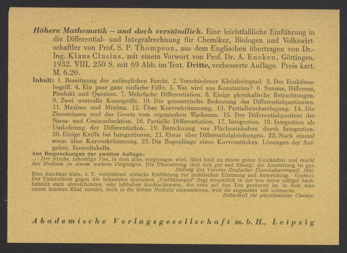 Advertisement for the German translation of Calculus Made Easy (1910), a textbook written by Silvanus P. Thompson (1851-1916) and published by the Academic Publishing Society Leipzig.