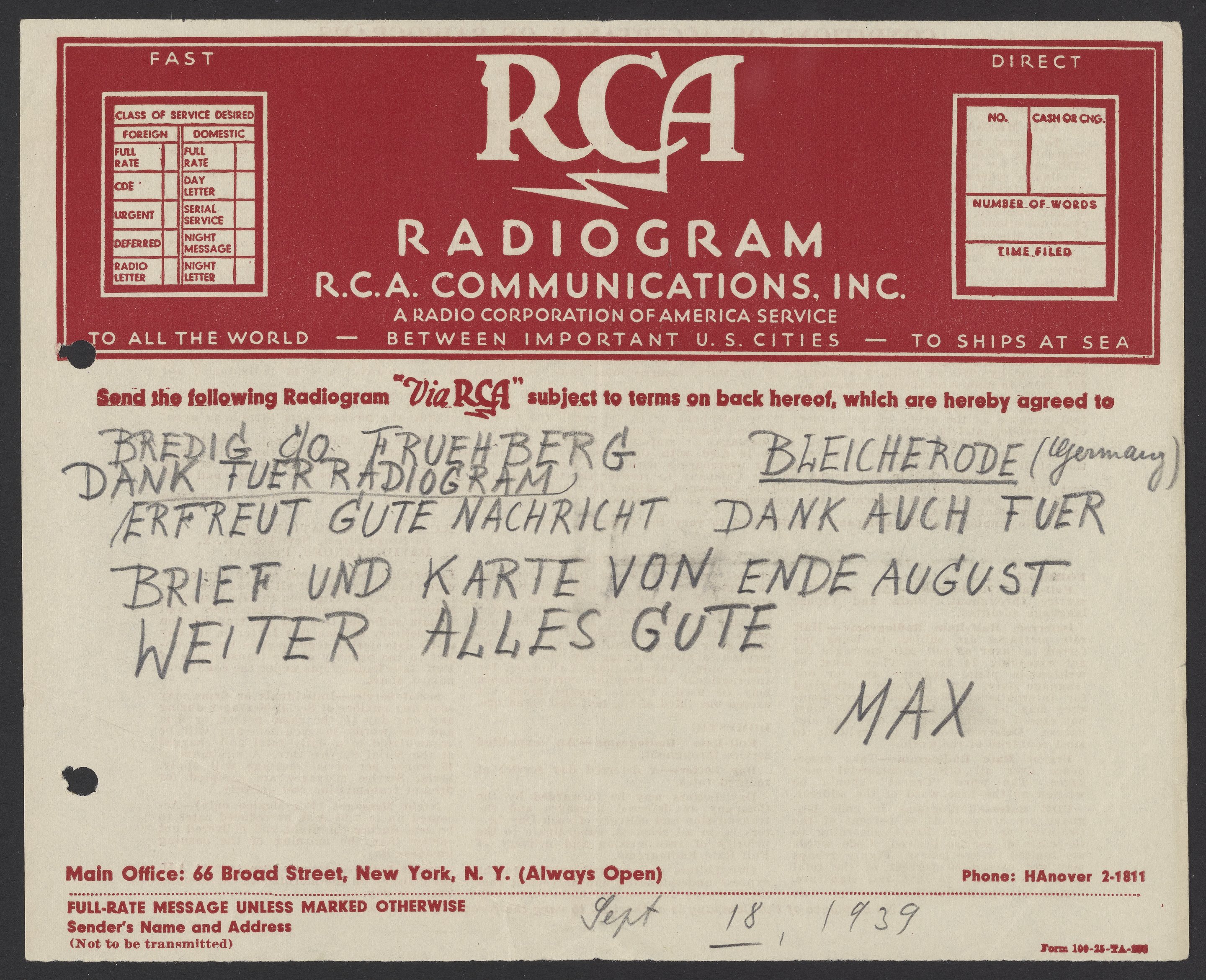 Radiogram from Max Bredig to Georg Bredig, September 18, 1939