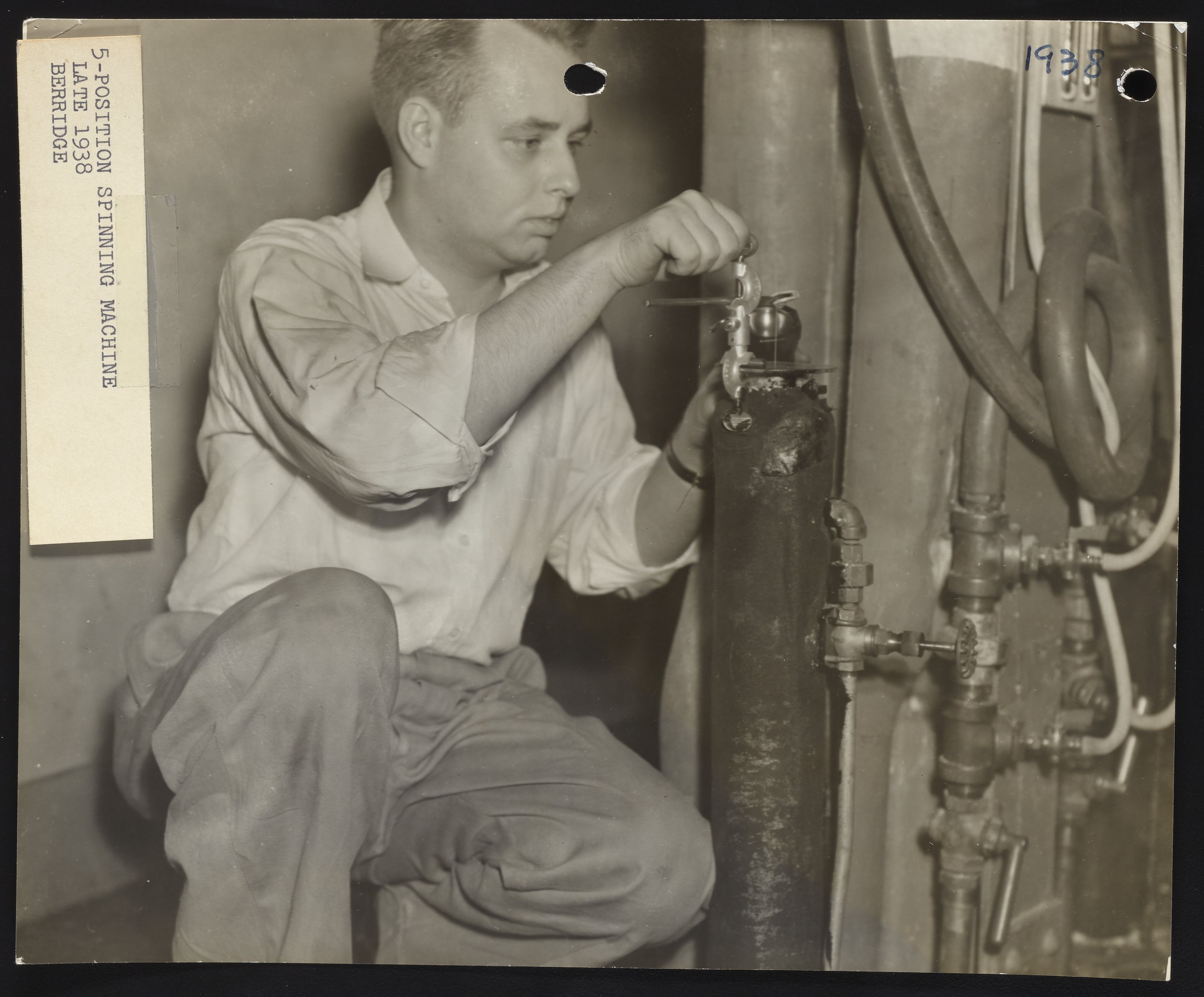 Close-up view of a DuPont employee adjusting a gas cylinder on a five-position windup machine at the DuPont pilot plant in Wilmington, Delaware during the early stages of nylon production and research. The employee is identified as "Mr. Berridge."