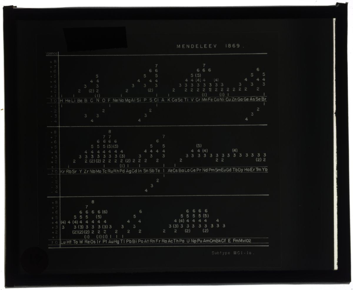 Series table designed by Dmitri Mendeleev (1869)1869 (Original design), Circa 1957 (Date attributed to slide)