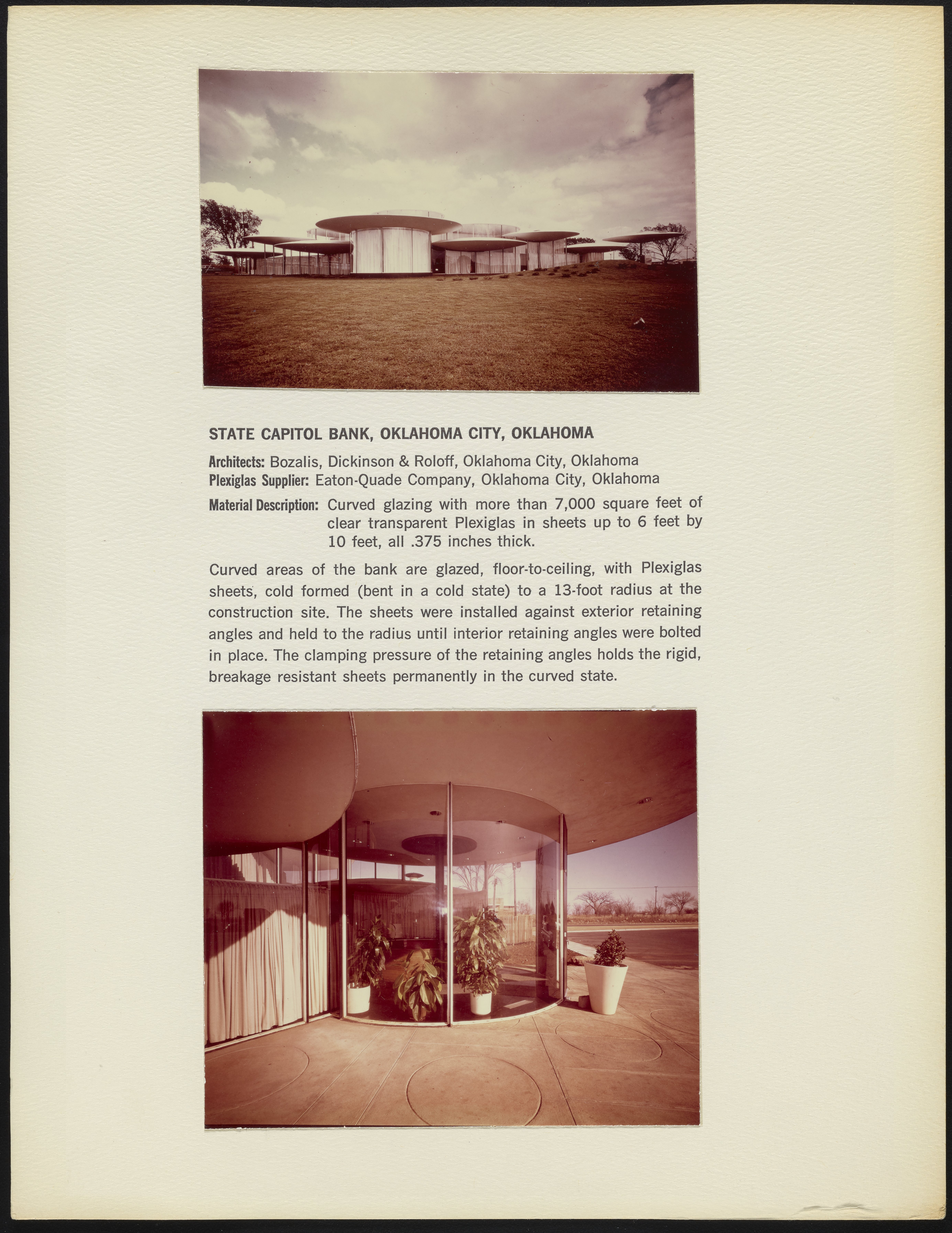 Two photographs depicting the State Capitol Bank building located in Oklahoma City, Oklahoma, part of a series documenting the use of Plexiglas in the building industry. Per notations accompanying the photographs, the building was designed by architectural firm Bozalis, Dickinson, & Roloff and features curved, floor-to-ceiling Plexiglas sheets supplied by Eaton-Quade Company.