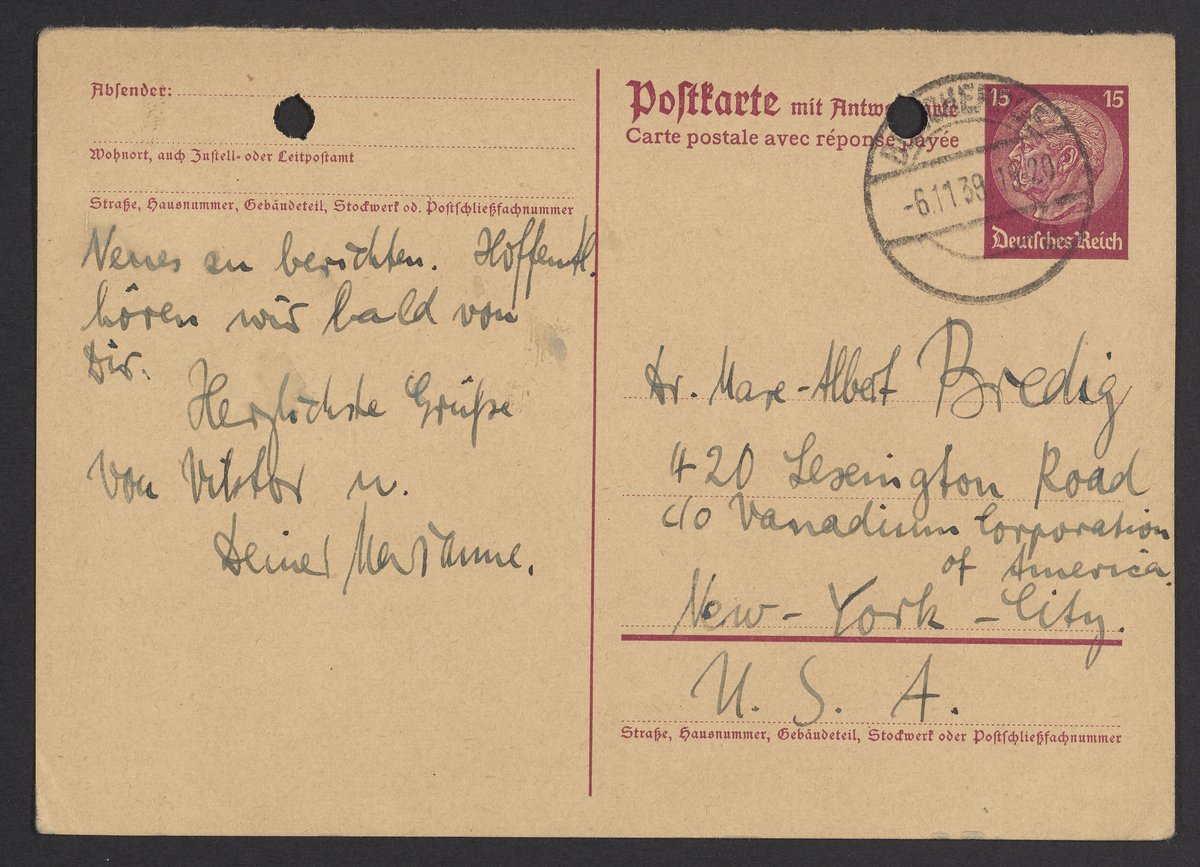 Homburger, Marianne. “Postcard from Marianne Homburger to Max Bredig, November 5, 1939,” November 5, 1939. Papers of Georg and Max Bredig, Box 8, Folder 18. Science History Institute. Philadelphia. https://digital.sciencehistory.org/works/8a2jp05.