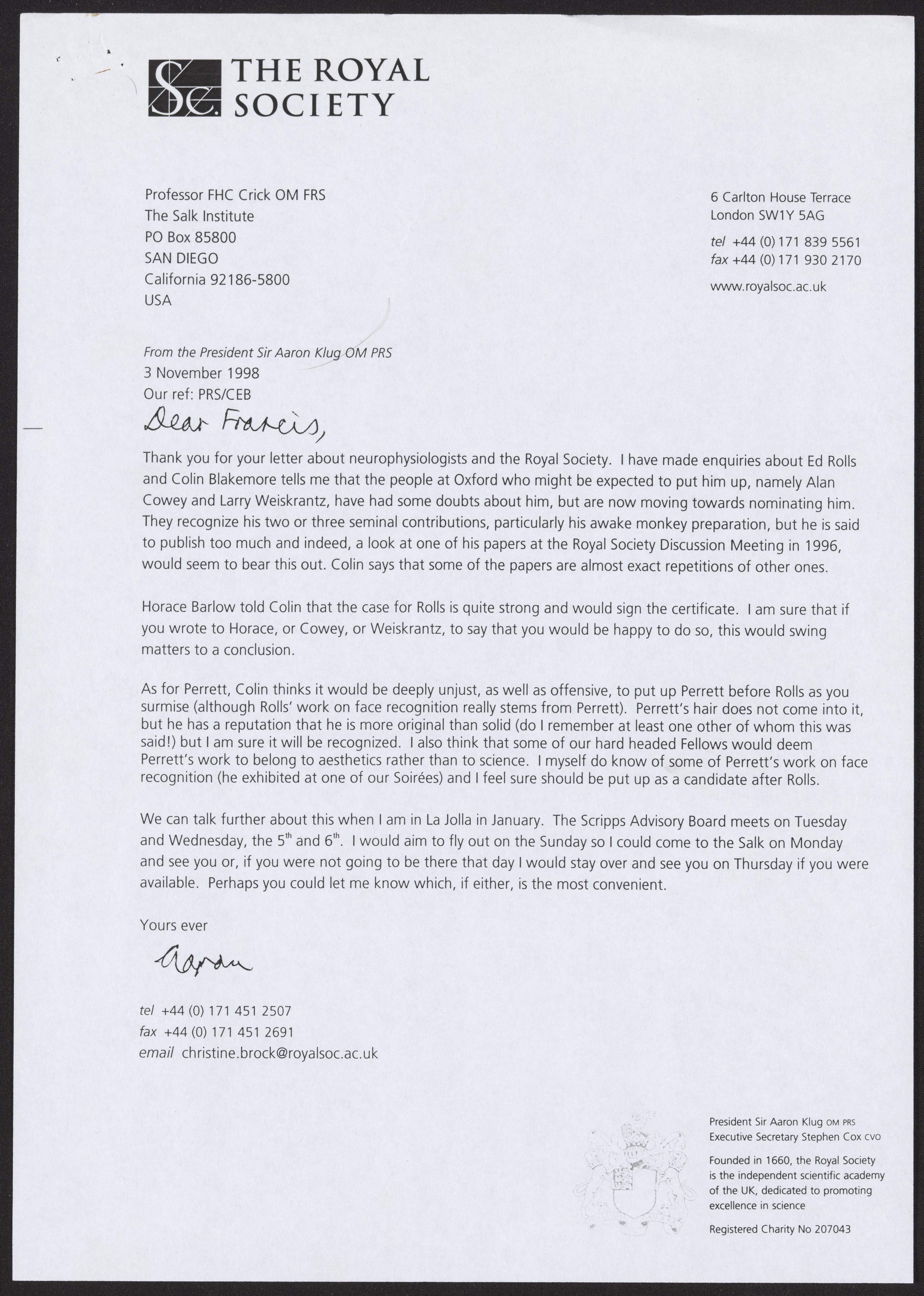 Klug, A. (Aaron), Sir. “Letter from Aaron Klug to Francis Crick, November 3, 1998,” November 3, 1998. History of Molecular Biology Collection, Box 20, Folder 6. Science History Institute. Philadelphia. https://digital.sciencehistory.org/works/8b37oy9.