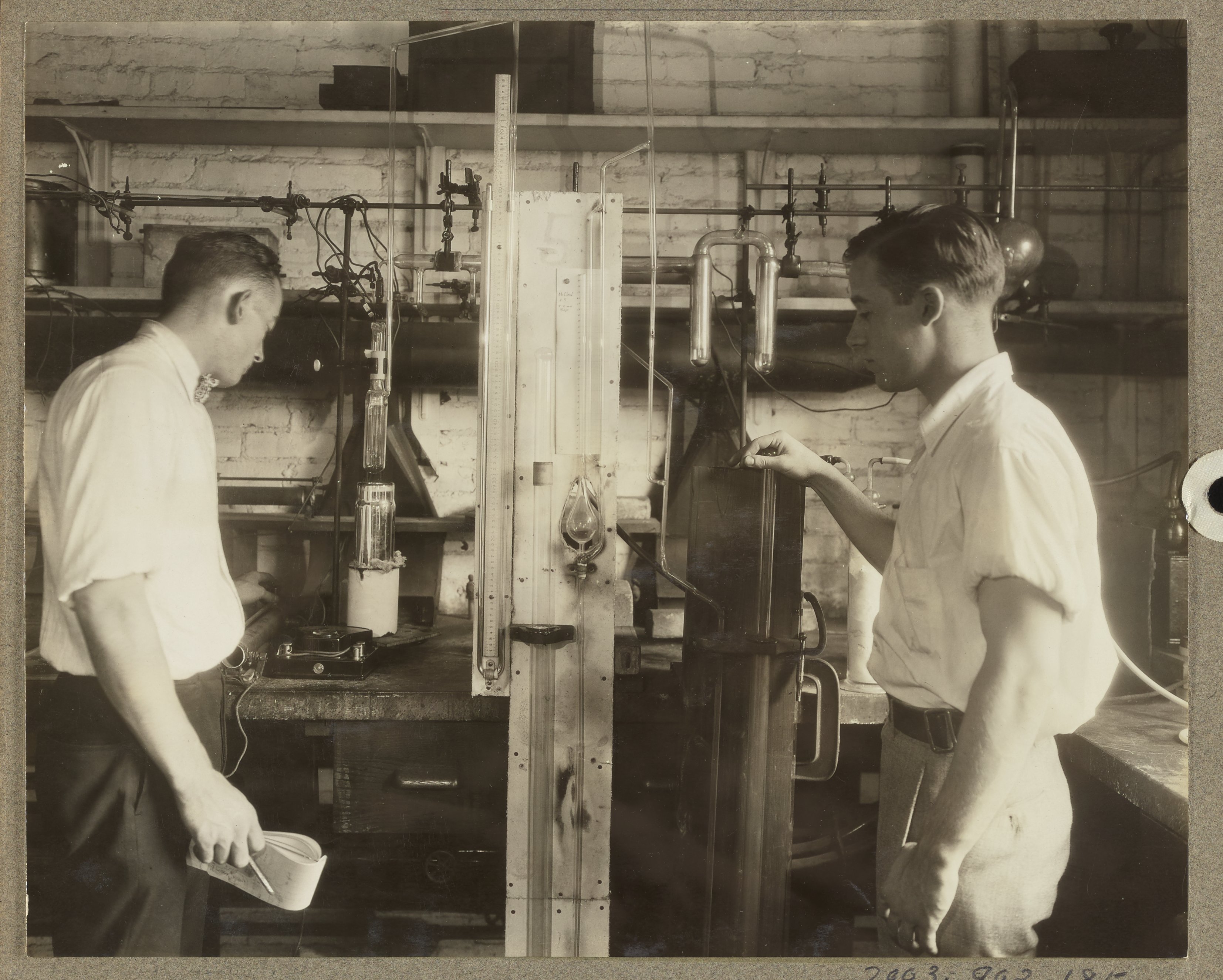 General view of an apparatus used to study the relative activity of potassium ions and electrons in the synthesis of ammonia from nitrogen and hydrogen gas at the U.S. Department of Agriculture's Fixed Nitrogen Research Laboratory located in Washington, D.C. The individuals present in the photograph are identified as Mr. Westhaver (left) and Mr. LaMar (right).