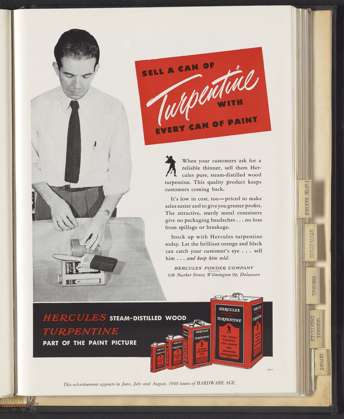 Hercules Incorporated. “Sell a Can of Turpentine with Every Can of Paint.” 1948 Hercules Advertisements, 1948. Records of Hercules Incorporated, Volume 1948. Science History Institute. Philadelphia. https://digital.sciencehistory.org/works/8c97kr26j.