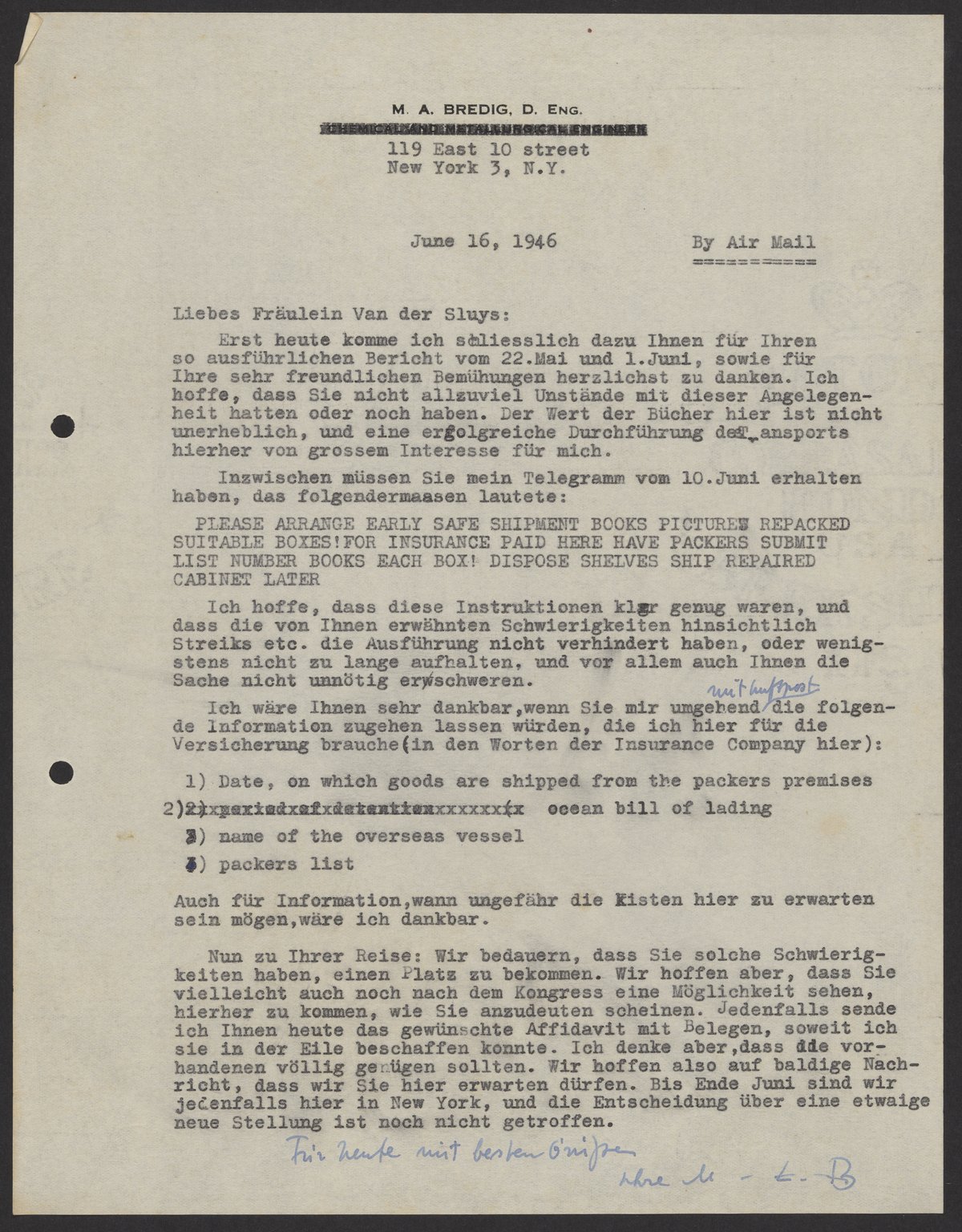 Letter from Max Albert Bredig (1902-1977) to Anny van der Sluys regarding the transportation of his father, Georg Bredig's (1868-1944), belongings from Holland.