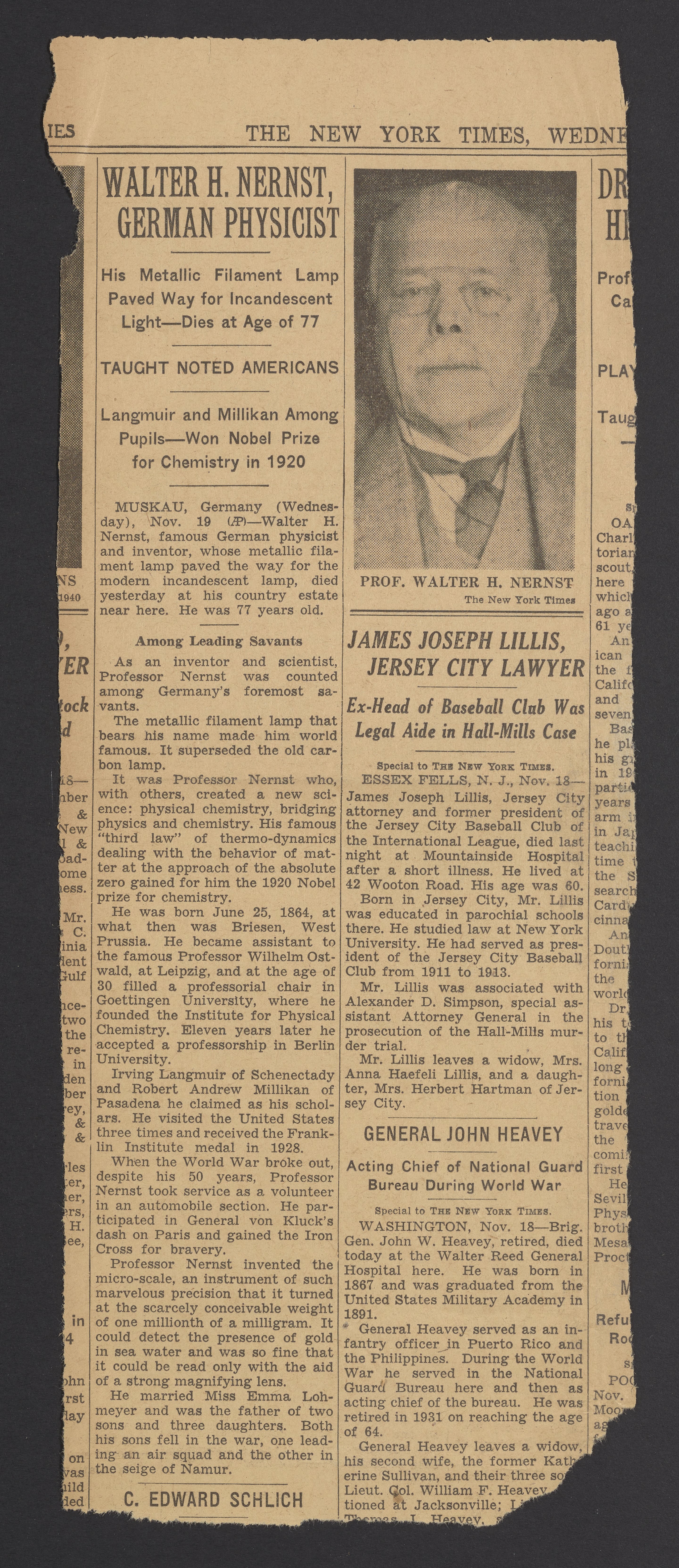 “Walter H. Nernst, German Physicist.” New York times, November 19, 1941. Papers of Georg and Max Bredig, Box 4, Folder 14. Science History Institute. Philadelphia. https://digital.sciencehistory.org/works/8j8odwl.