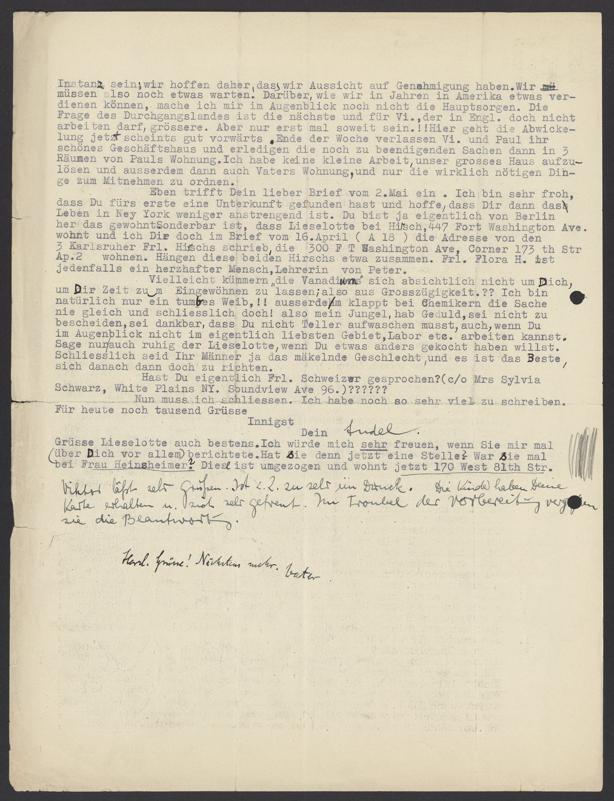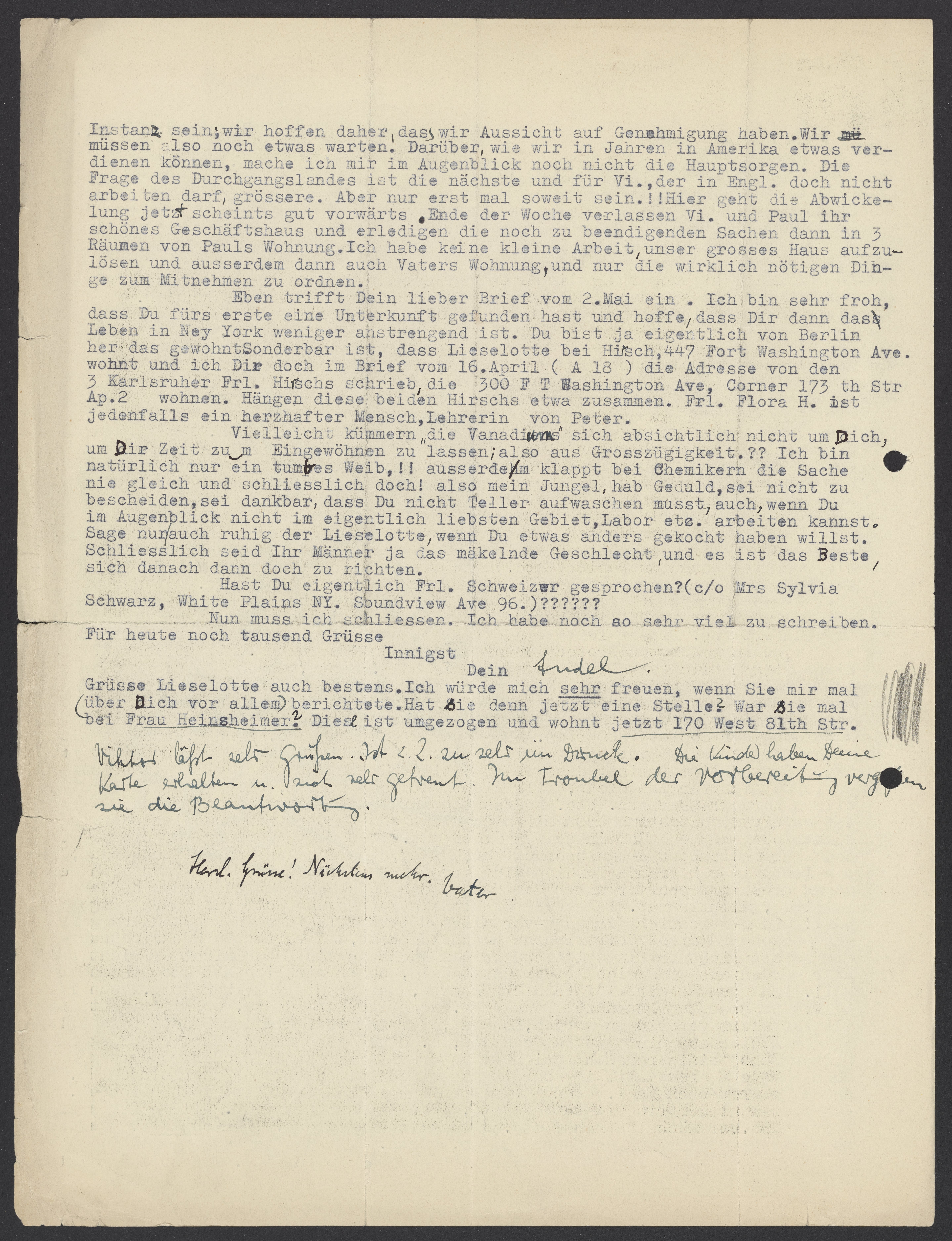 Eben trifft Dein lieber Brief vom 2.Mai ein. Ich bin sehr froh, dass Du fürs erste eine Unterkunft gefunden hast und hoffe dass Dir dann das Leben in New York weniger anstrengend ist. Du bist ja eigentlich von Berlin her das gewohnt. Sonderbar ist, dass Lieselotte bei Hirsch, 447 Fort Washington Ave. wohnt und ich Dir doch im Brief vom 16.April (A 18) die Adresse von den 3 Karlsruher Frl. Hirschs schrieb, die 3300 Fort Washington Ave, Corner 173th Str, Ap.2 wohnen. Hängen diese beiden Hirschs etwa zusammen. Frl. Flora H. ist jedenfalls ein herzhafter Mensch, Lehrerin von Peter.