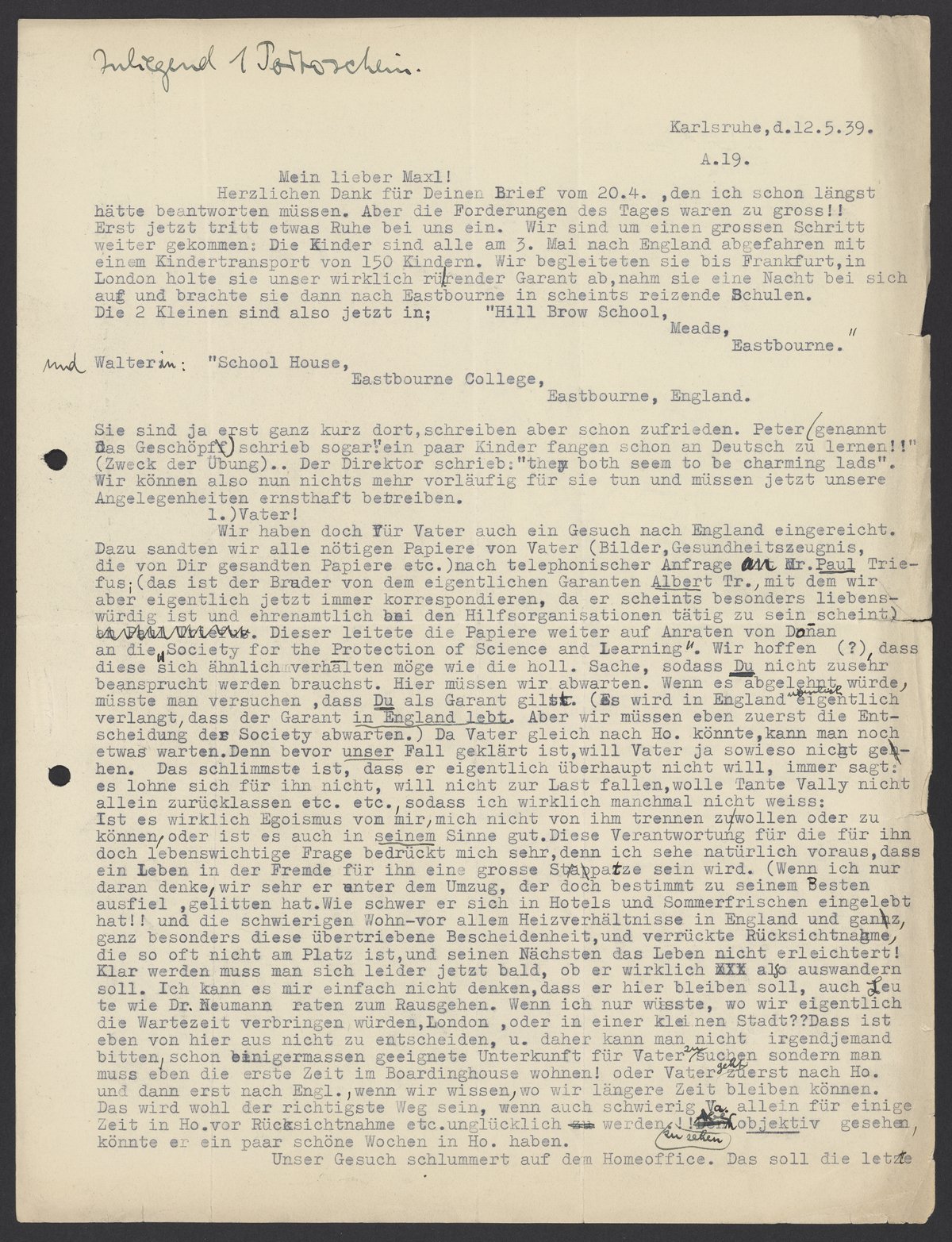 Herzlichen Dank für Deinen Brief vom 20.4.,den ich schon längst hätte beantworten müssen. Aber die Forderungen des Tages waren zu gross!! Erst jetzt tritt etwas Ruhe bei uns ein. Wir sind um einen grossen Schritt weiter gekommen: Die Kinder sind alle am 3. Mai nach England abgefahren mit einem Kindertransport von 150 Kindern. Wir begleiteten sie bis Frankfurt, in London holte sie unser wirklich rührender Garant ab, nahm sie eine Nacht bei sich auf und brachte sie dann nach Eastbourne in scheints reizende Schulen. Die 2 Kleinen sind also jetzt in „Hill Brown School, Meads, Eastbourne“ und Walter in „School House, Eastbourne College, Eastbourne, England.“