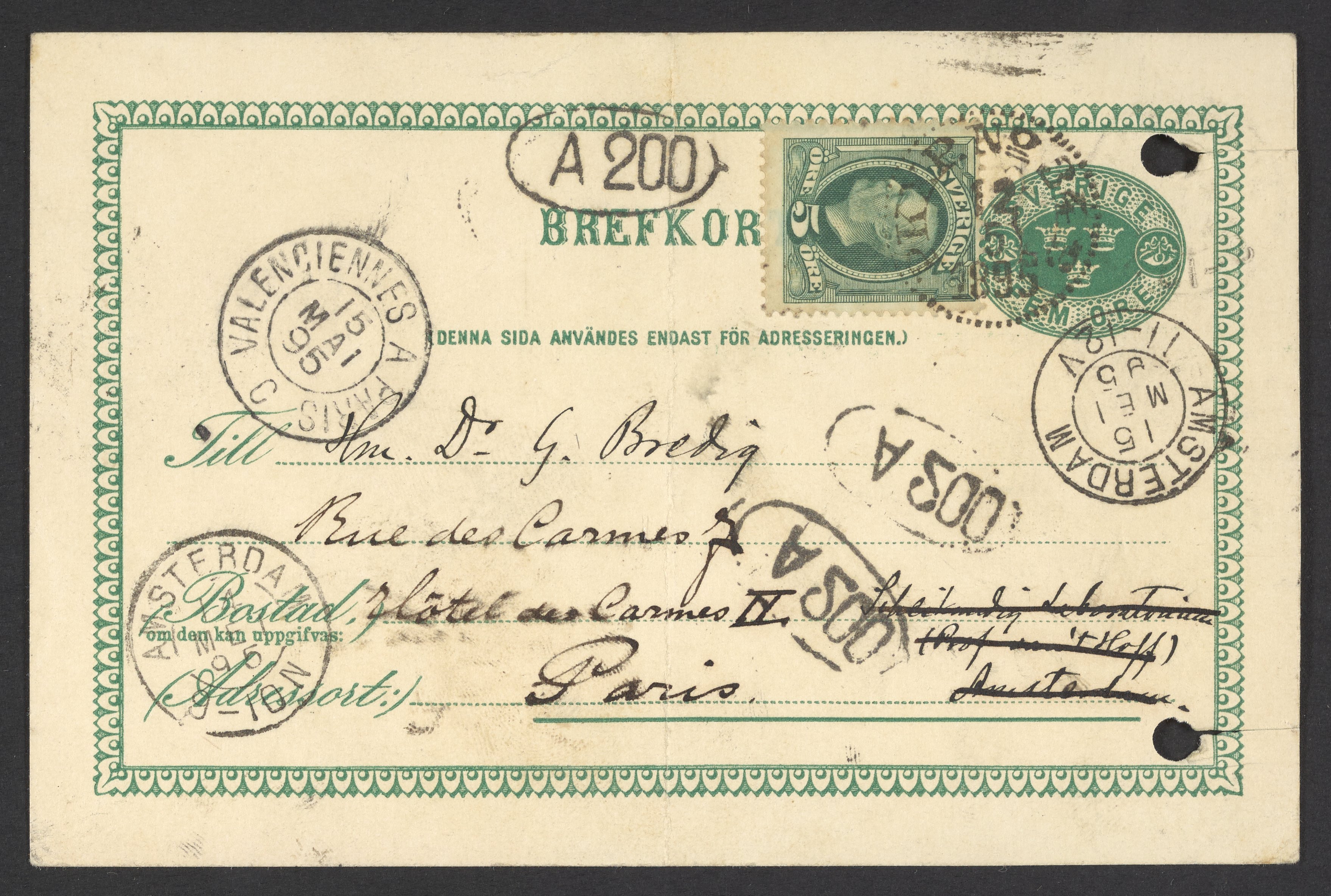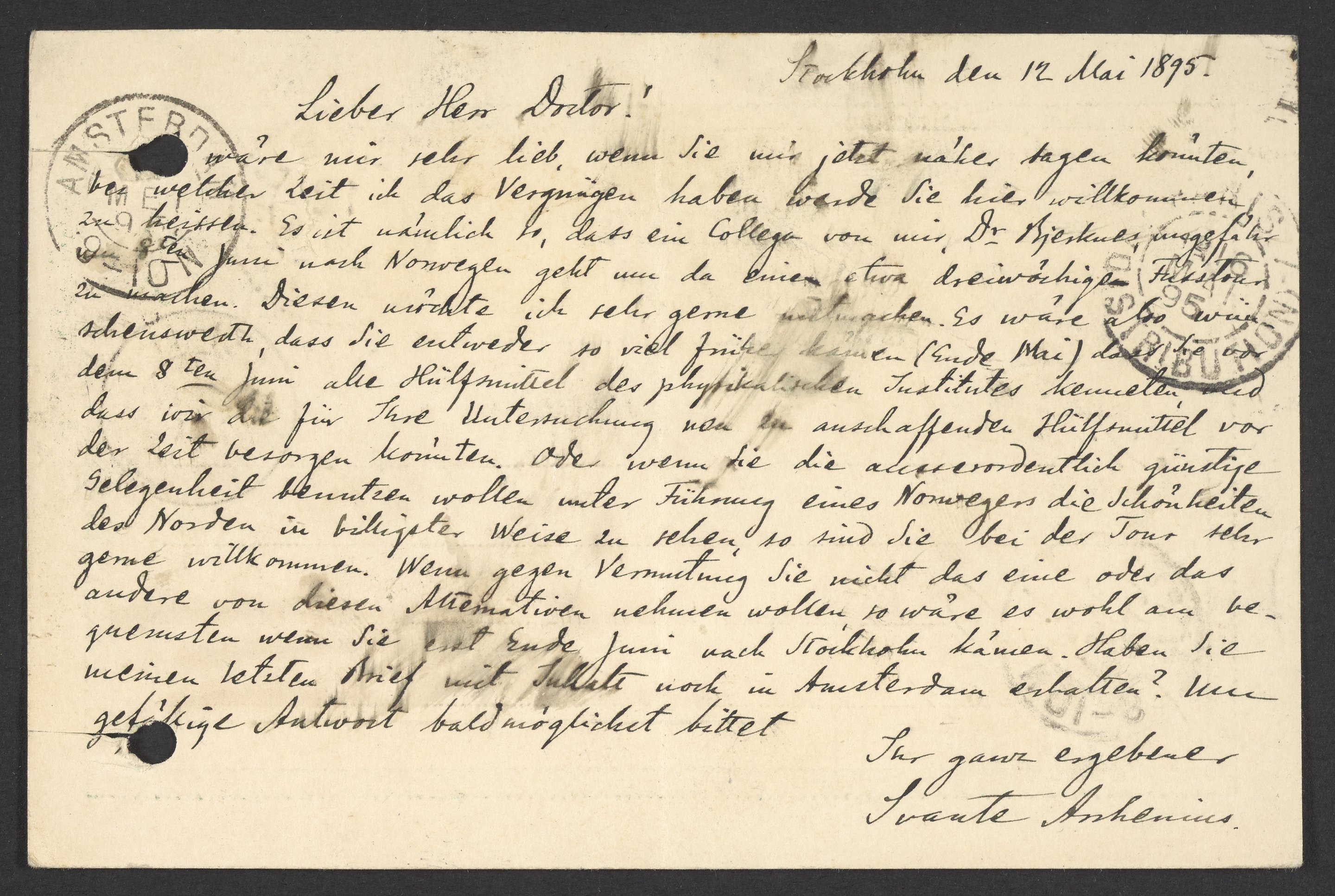Arrhenius, Svante. “Postcard from Svante Arrhenius to Georg Bredig, May 1895,” May 12, 1895. Papers of Georg and Max Bredig, Box 1, Folder 5. Science History Institute. Philadelphia. https://digital.sciencehistory.org/works/8k6qtis.
