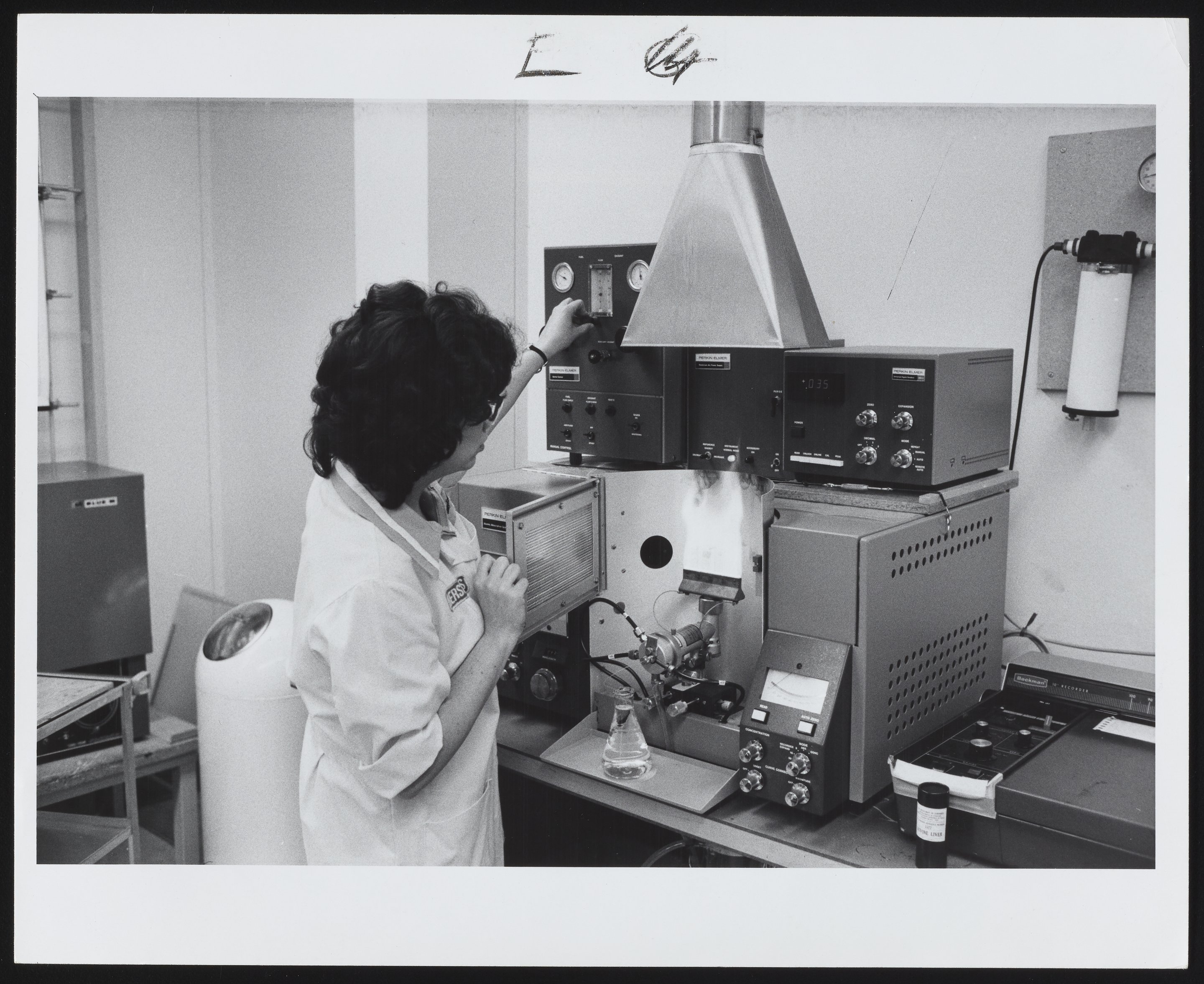 General view of laboratory technician Margaret Kreiser using assorted Perkin-Elmer atomic absorption instruments at a Hershey Company facility to determine the metal constituents of finished food items and raw materials. Per notations accompanying the photograph, chocolate typically contains 12 metals in trace amounts.