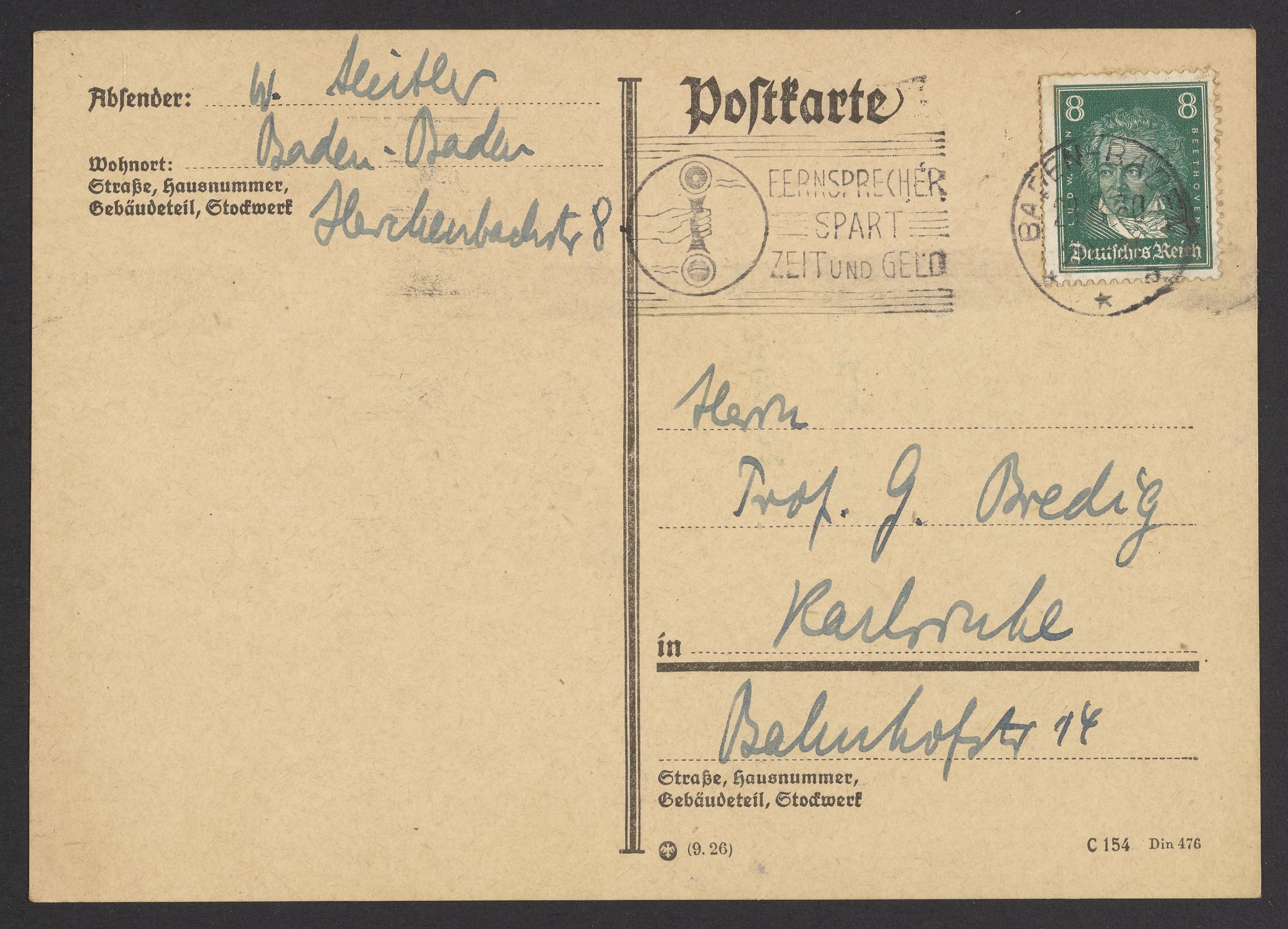 Postcard from Walter Heitler to Georg Bredig, August 1930