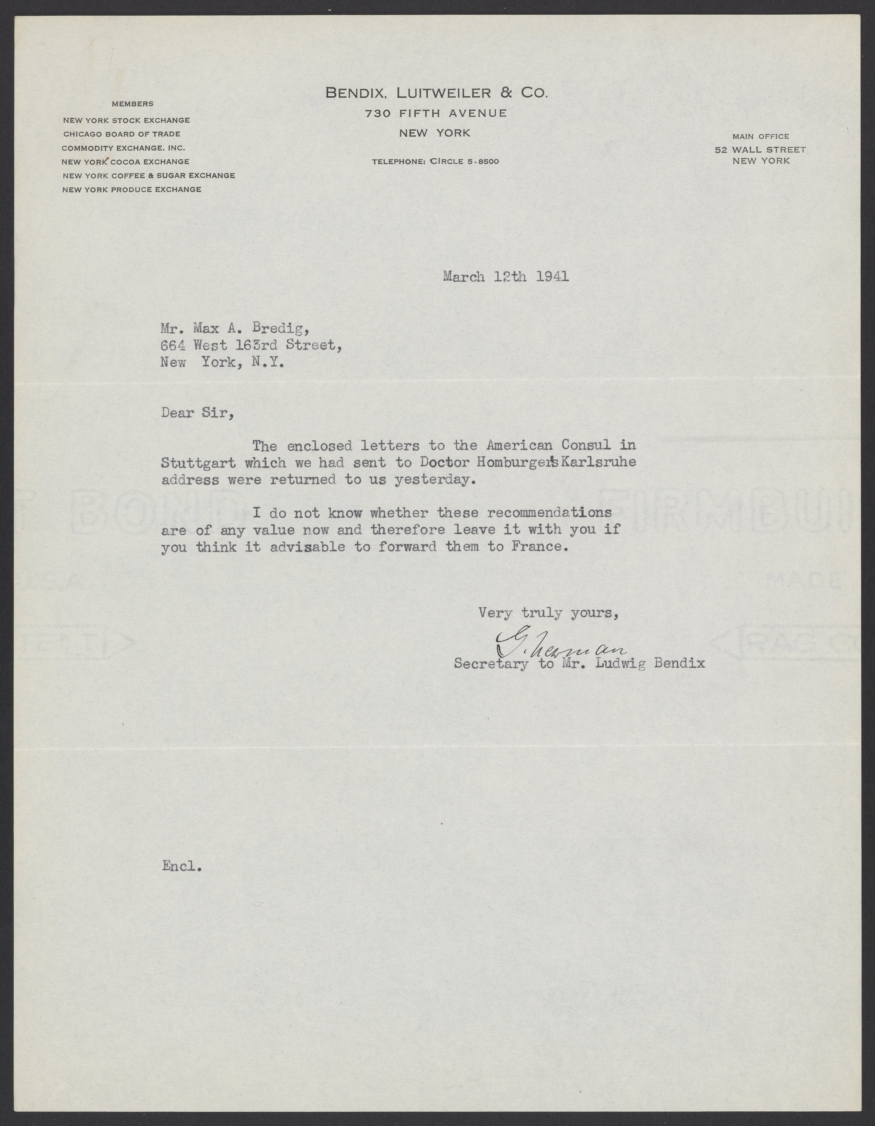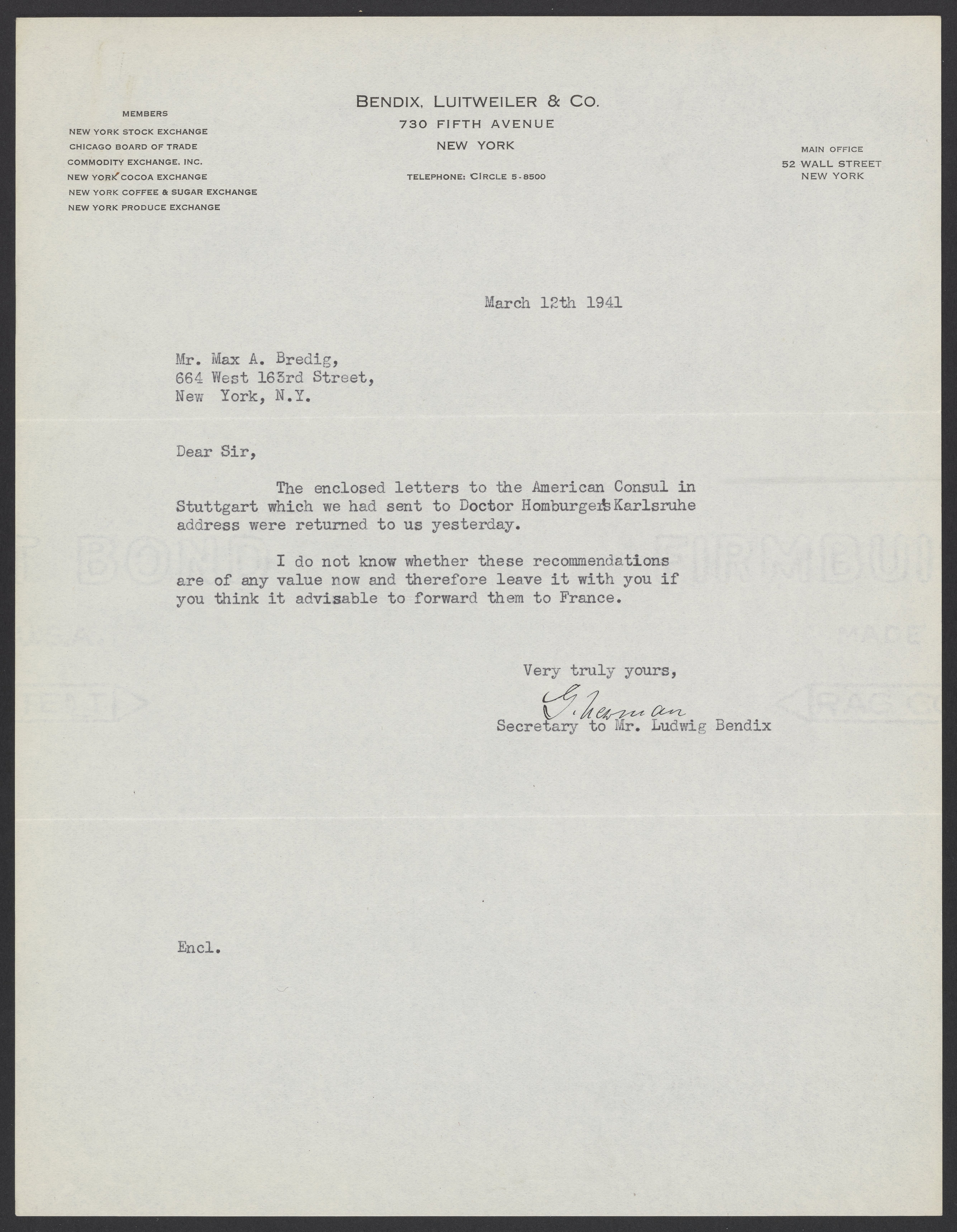 Ludwig Bendix, New York investment banker, informs Max Bredig (1902-1977) that a letter sent to Viktor Homburger's (1888-1968) German address was returned. Bendix is a longtime friend and colleague of Homburger, who is Bredig's brother-in-law. Bendix is assisting Bredig in securing immigration visas for Viktor and his wife, Max's sister, Marianne Homburger (1903-1986).