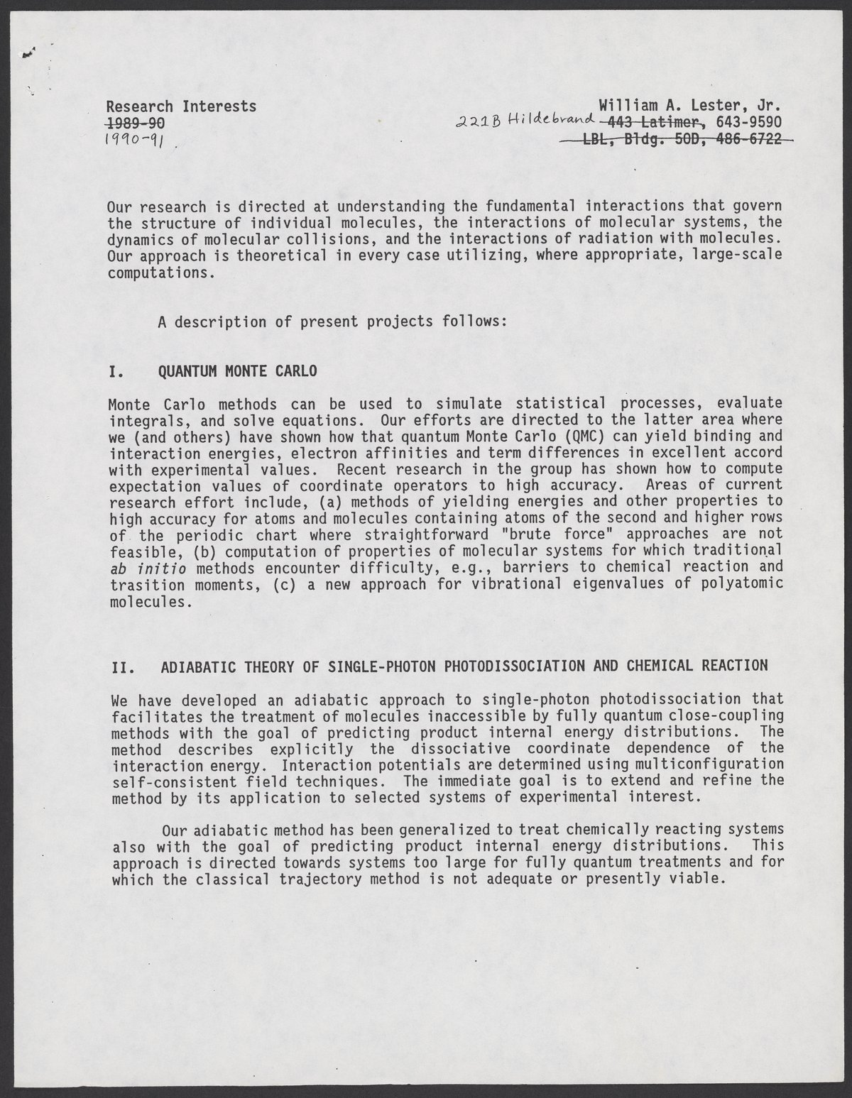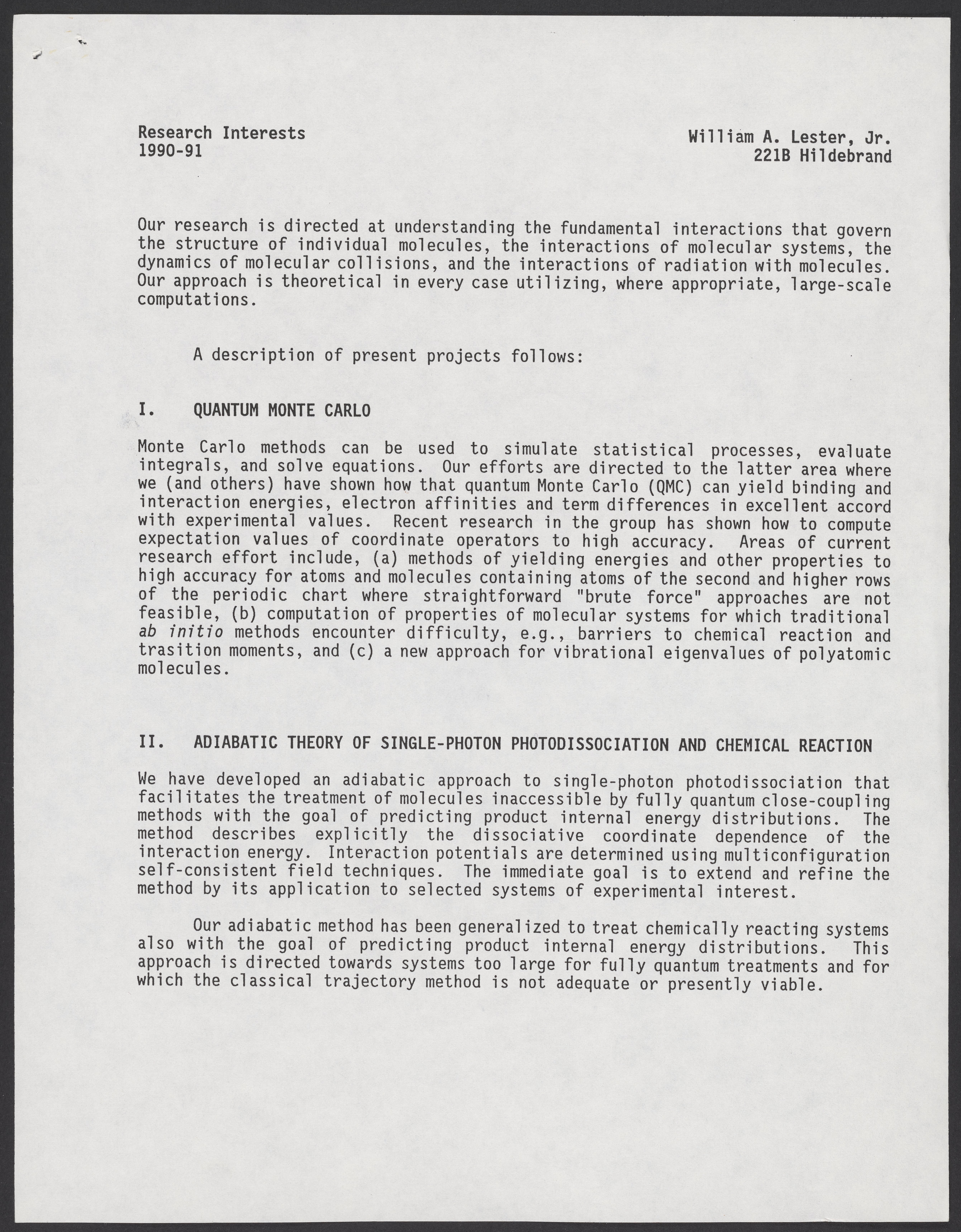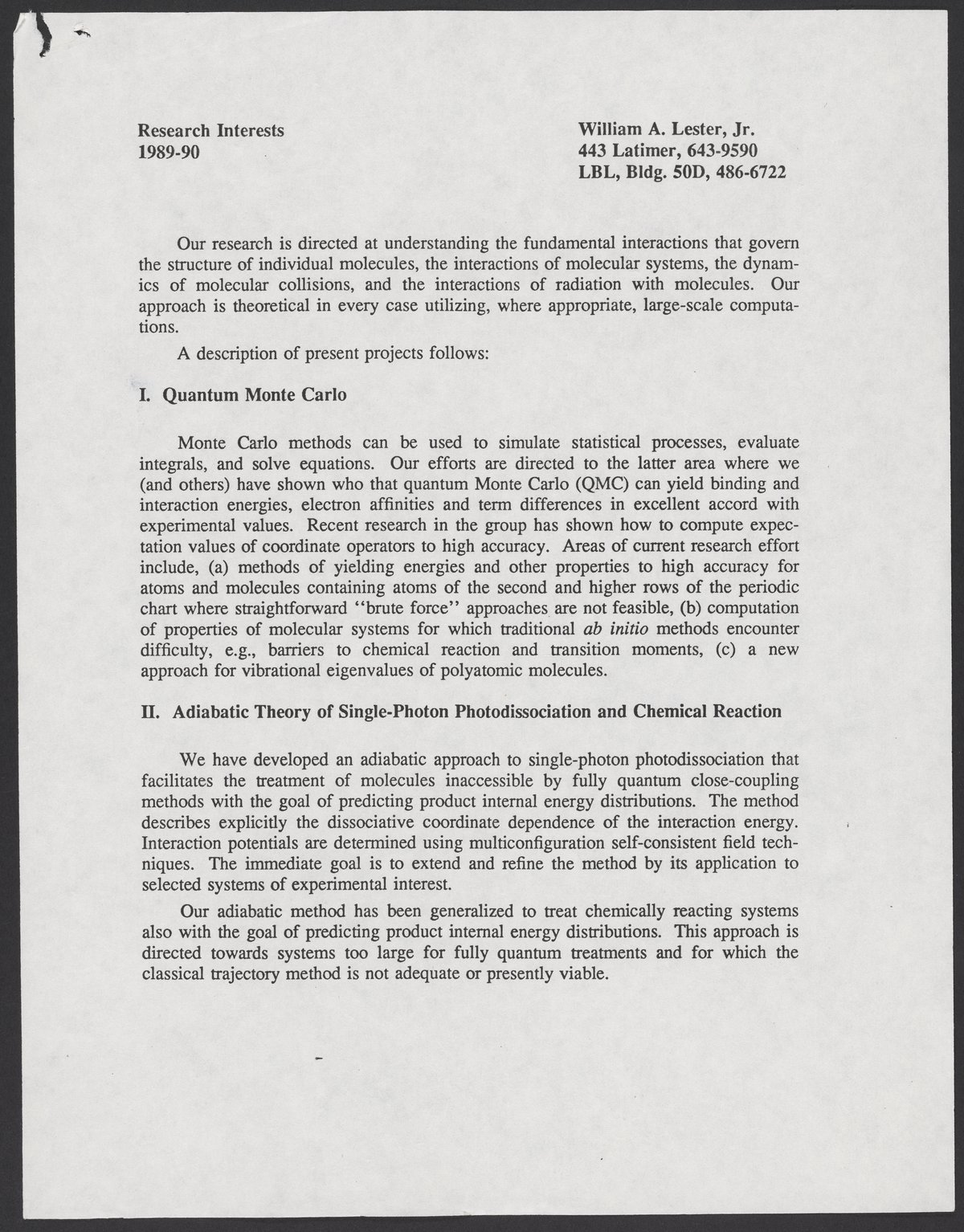 Lester, William A., Jr. “Research Interests of William A. Lester, Jr.,” 1989–1991. William A. Lester, Jr. Papers, Box 33, Folder 22. Science History Institute. Philadelphia. https://digital.sciencehistory.org/works/8mas3e2.