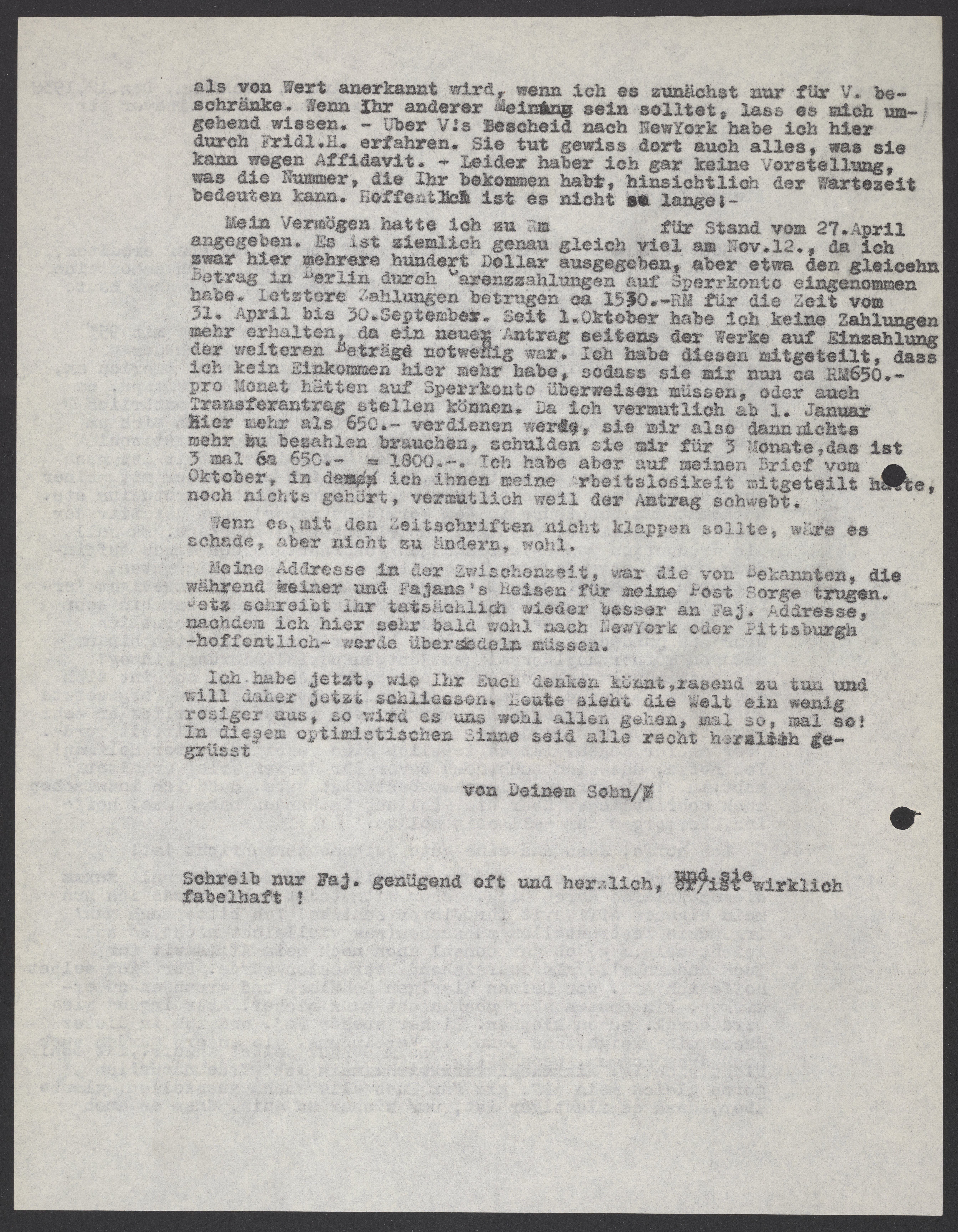 Mein Vermögen hatte ich zu Rm für Stand vom 27.April angegeben. Es ist ziemlich genau gleich viel am Nov.12., da ich zwar hier mehrere hundert Dollar ausgegeben, aber etwa den gleichen Betrag in Berlin durch Carenzzahlungen auf Sperrkonto eingenommen habe. Letztere Zahlungen betrugen ca 1530. -RM für die Zeit vom 31.April bis 30.September. Seit 1.Oktober habe ich keine Zahlungen mehr erhalten, da ein neuer Antrag seitens der Werke auf Einzahlung der weiteren Beträge notwendig war. Ich habe diesen mitgeteilt, das ich kein Einkommen hier mehr habe, sodass sie mir nun ca. RM650.- pro Monat hätten auf Sperrkonto überwiesen müssen, oder auch Transferantrag stellen können. Da ich vermutlich ab 1.Januar hier mehr als 650.- verdienen werde, sie mir also dann nichts mehr zu bezahlen brauchen, schulden sie mir für 3 Monate, das ist 3 mal ca 650.- = 1800.- Ich habe aber auf meinen Brief vom Oktober, in dem ich ihnen meine Arbeitslosigkeit mitgeteilt hatte noch nichts gehört, vermutlich weil der Antrag schwebt.