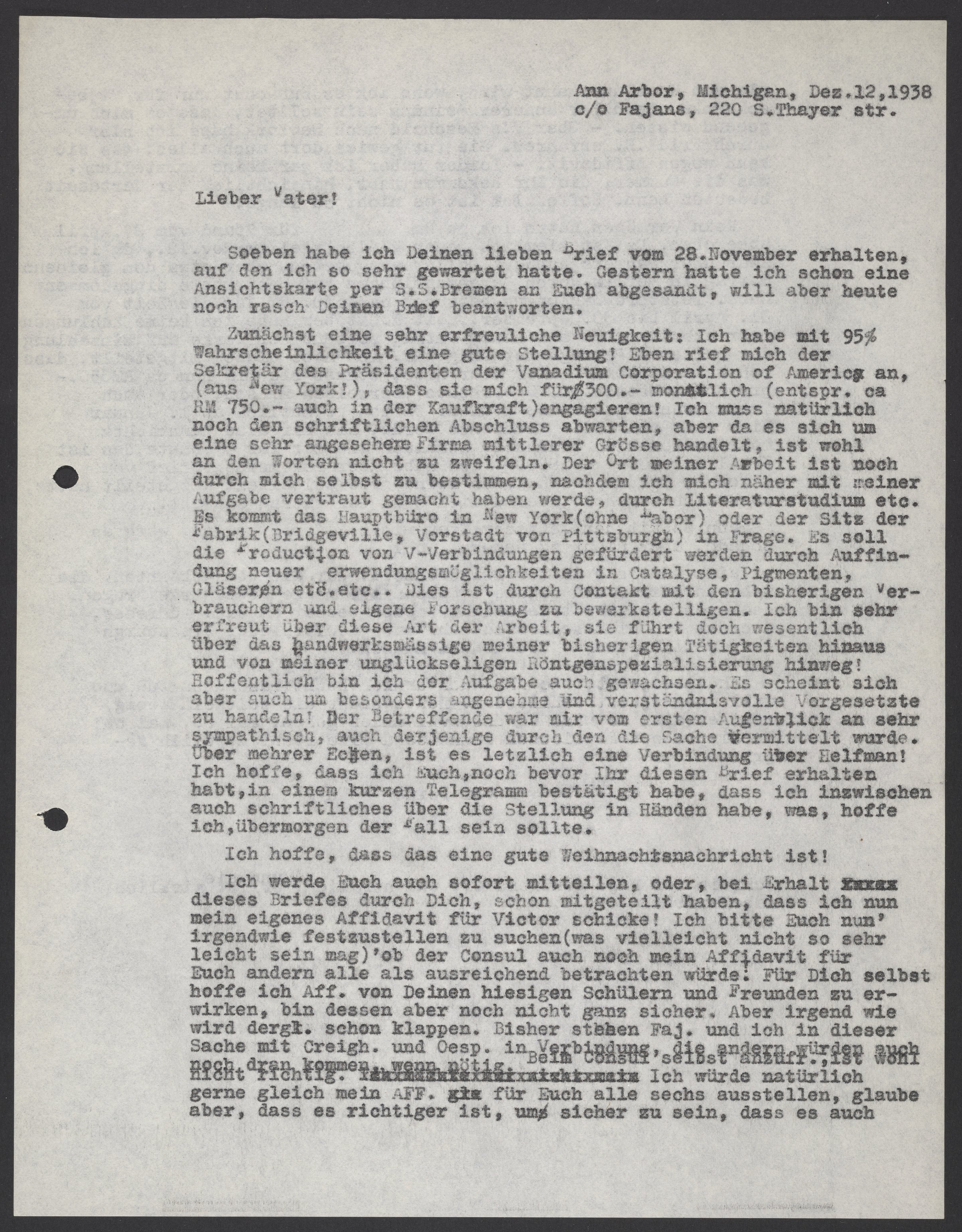 Zunächst eine sehr erfreuliche Neuigkeit: Ich habe mit 95% Wahrscheinlichkeit eine gute Stellung! Eben rief mich der Sekretär des Präsidenten der Vanadium Corporation of America an, (aus New York!), dass sie mich $300.-monatlich (entspr. ca RM 750.- auch in der Kaufkraft) engagieren! Ich muss natürlich noch den schriftlichen Abschluss abwarten, aber da es sich um eine sehr angesehene Firm mittlerer Grösse handelt, ist wohl an den Worten nicht zu zweifeln. Der Ort meiner Arbeit ist noch durch mich selbst zu bestimmen, nachdem ich mich näher mit meiner Aufgabe vertraut gemacht haben werde, durch Literaturstudium etc. Es kommt das Hauptbüro in New York (ohne Labor) oder der Sitz der Fabrik (Bridgeville, Vorstadt von Pittsburgh) in Frage. Es soll die Production von V-Verbidnungen gefördert werden durch Auffindung neuer erwendungsmöglichkeiten in Catalyse, Pigmenten, Glaesern etc... Dies ist durch Contakt mit den bisherigen Verbrauchern und einige Forschung zu bewerkstelligen. Ich bin sehr erfreut über diese Art der Arbeit, sie führt doch wesentlich über das handwerksmässige meiner bisherigen Tätigkeiten hinaus und von meiner unglückseligen Röntgenspezialisierung hinweg! Hoffentlich bin ich der Aufgabe auch gewachsen. Es scheint sich aber auch um besonders angenehme und verständnisvolle Vorgesetzte zu handeln! Der Betreffende war mir vom ersten Augenblick an sehr sympathisch, auch derjenige durch den die Sache vermittelt wurde. Über mehrer Ecken, ist es letzlich eine Verbindung über Helfman! Ich hoffe, dass ich Euch, noch bevor Ihr diesen Brief erhalten habt, in einem kurzen Telegramm bestätigt habe, dass ich inzwischen auch schriftliches über die Stellung in Händen habe, was, hoffe ich, übermorgen der Fall sein sollte.
