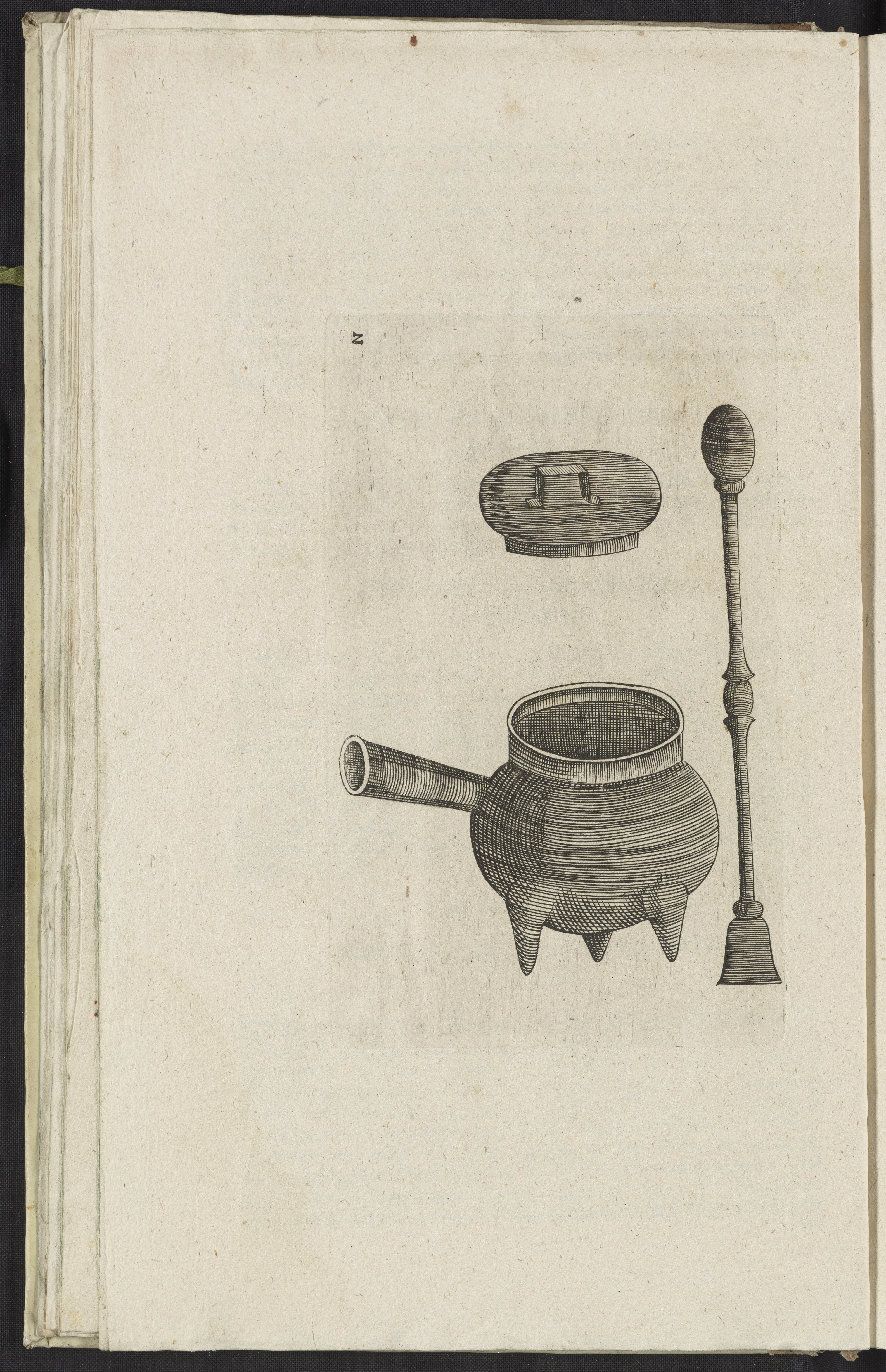 Brawe, Hermann. “Plate 2: Metal Pipkin with Lid and Rod for Cooking Explosives.” In Vollenkommene Unterweisung, Wie Raketen, Feuer- Wasser- Sturm-Kugeln, Granaten, Pech-Sturm-Kräntze, Und Allerhand Lust Und Ernsthaffte Feuer-Wercke Zubereiten. Osnabrück, Germany: Johann Georg Schwänder, 1660. https://digital.sciencehistory.org/works/8p58pd20p.