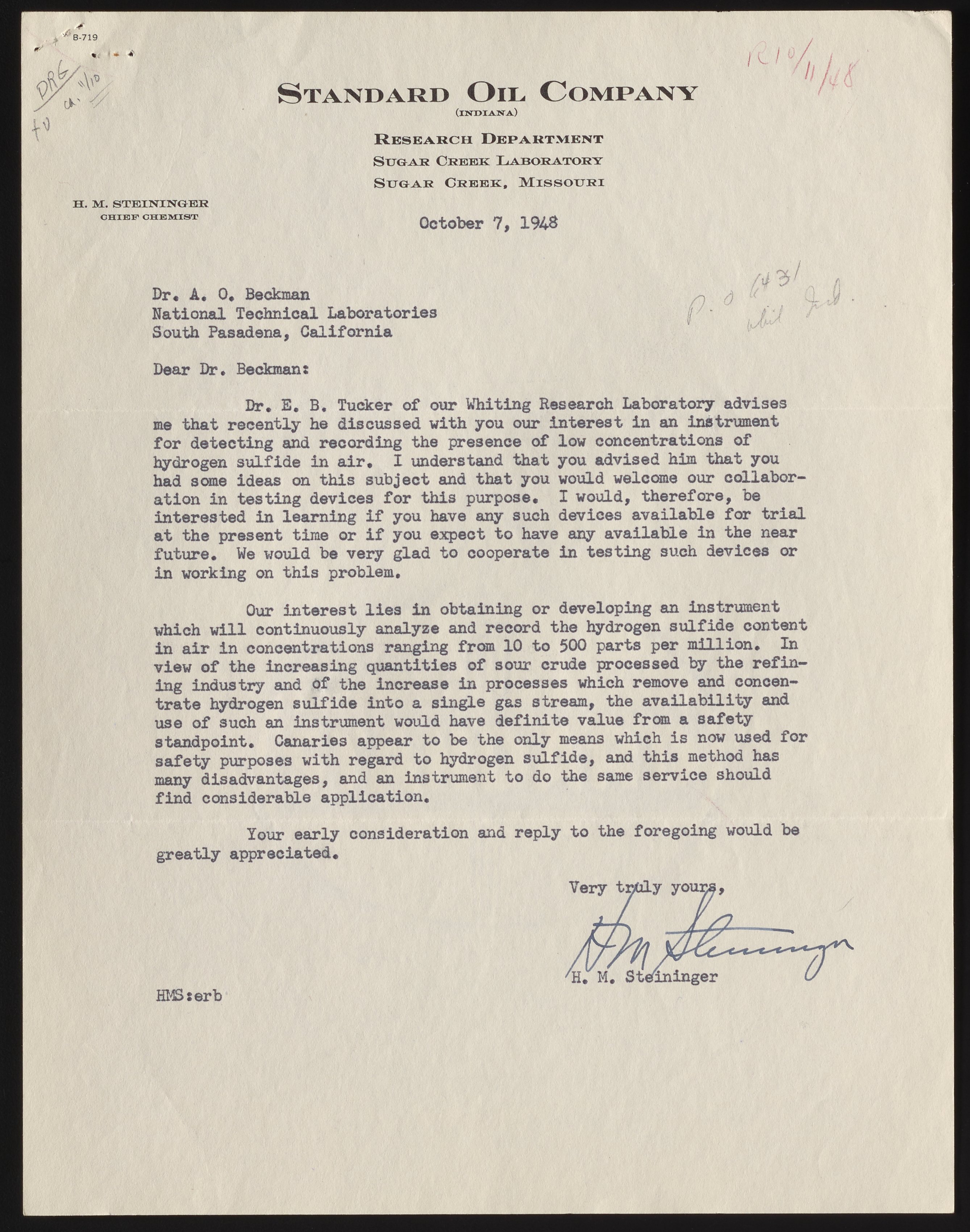 A chemist with Standard Oil Company's Research Department, Steininger explored the possible creation of an instrument to analyze and record hydrogen sulfide concentrations in oil refineries, a safety measure otherwise performed by canaries. There is no evidence that Beckman developed such a device, but he did offer a reply to the inquiry.