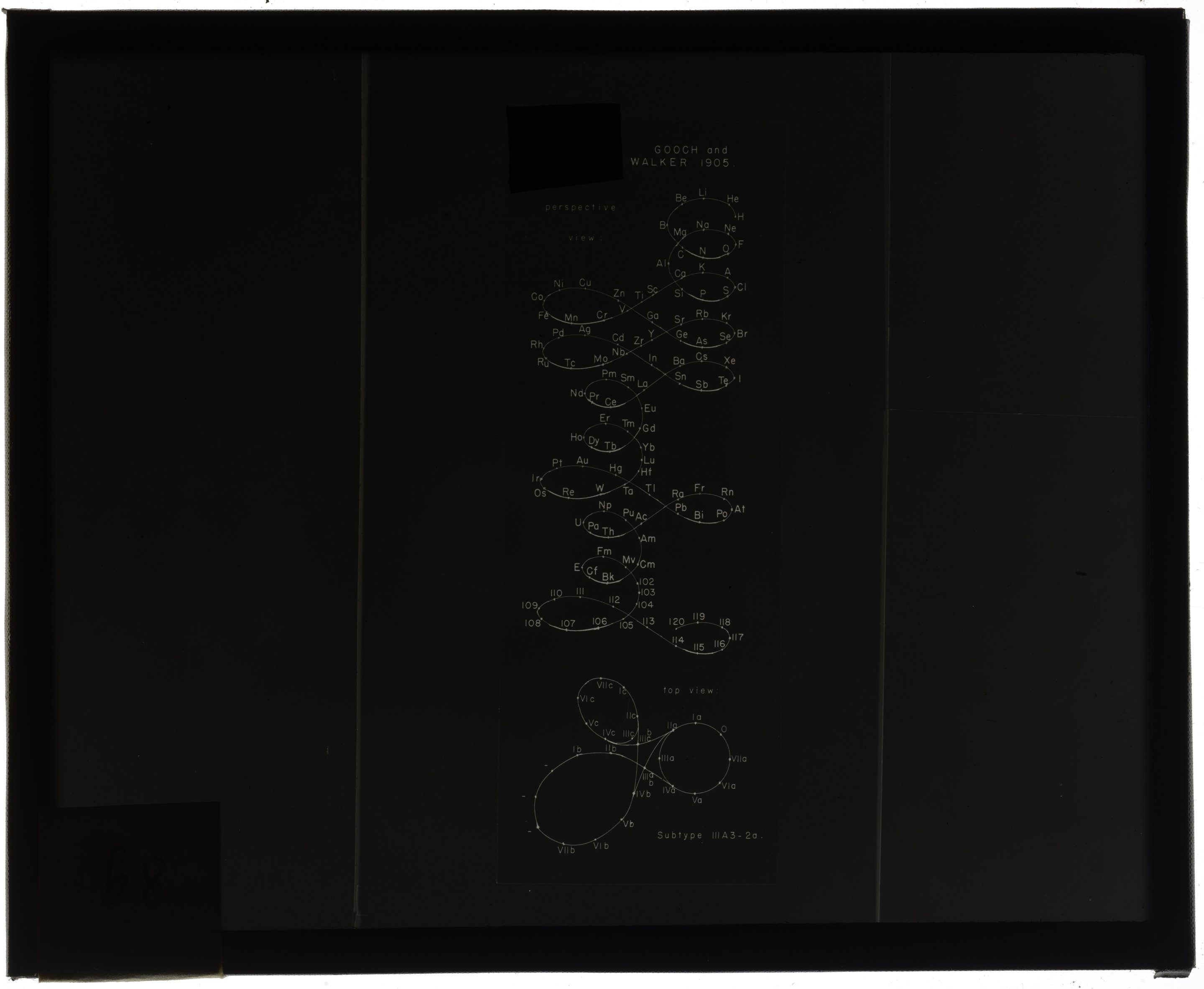 Walker, Claude Frederic, Edward G. Mazurs, and Frank Austin Gooch. “Periodic Table in Style of Helix and Space Lemniscate with Two Additional Loops for Rare Earth Elements.” Glass (material), circa 1905–1957. Edward G. Mazurs Collection of Periodic Systems Images, Box 2. Science History Institute. Philadelphia. https://digital.sciencehistory.org/works/8p58pd55s.