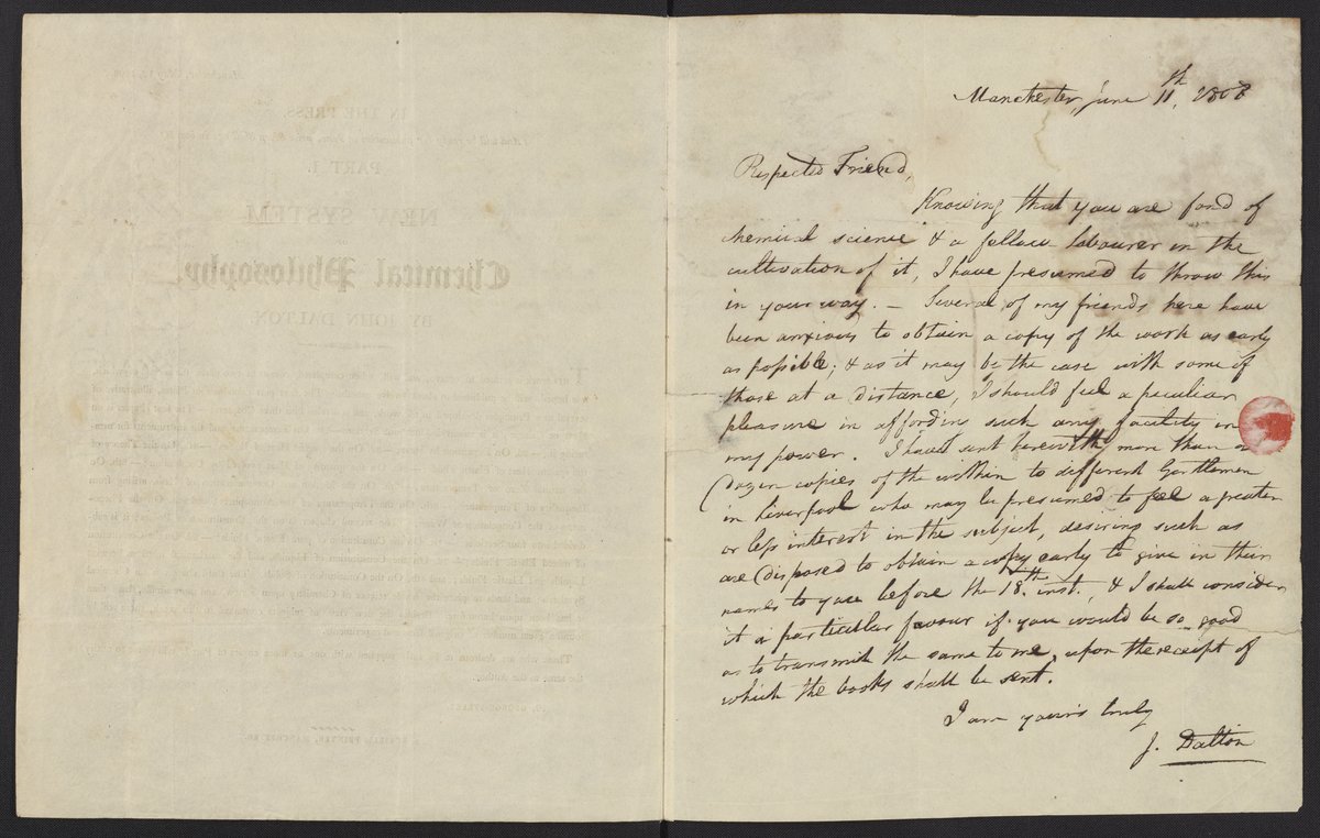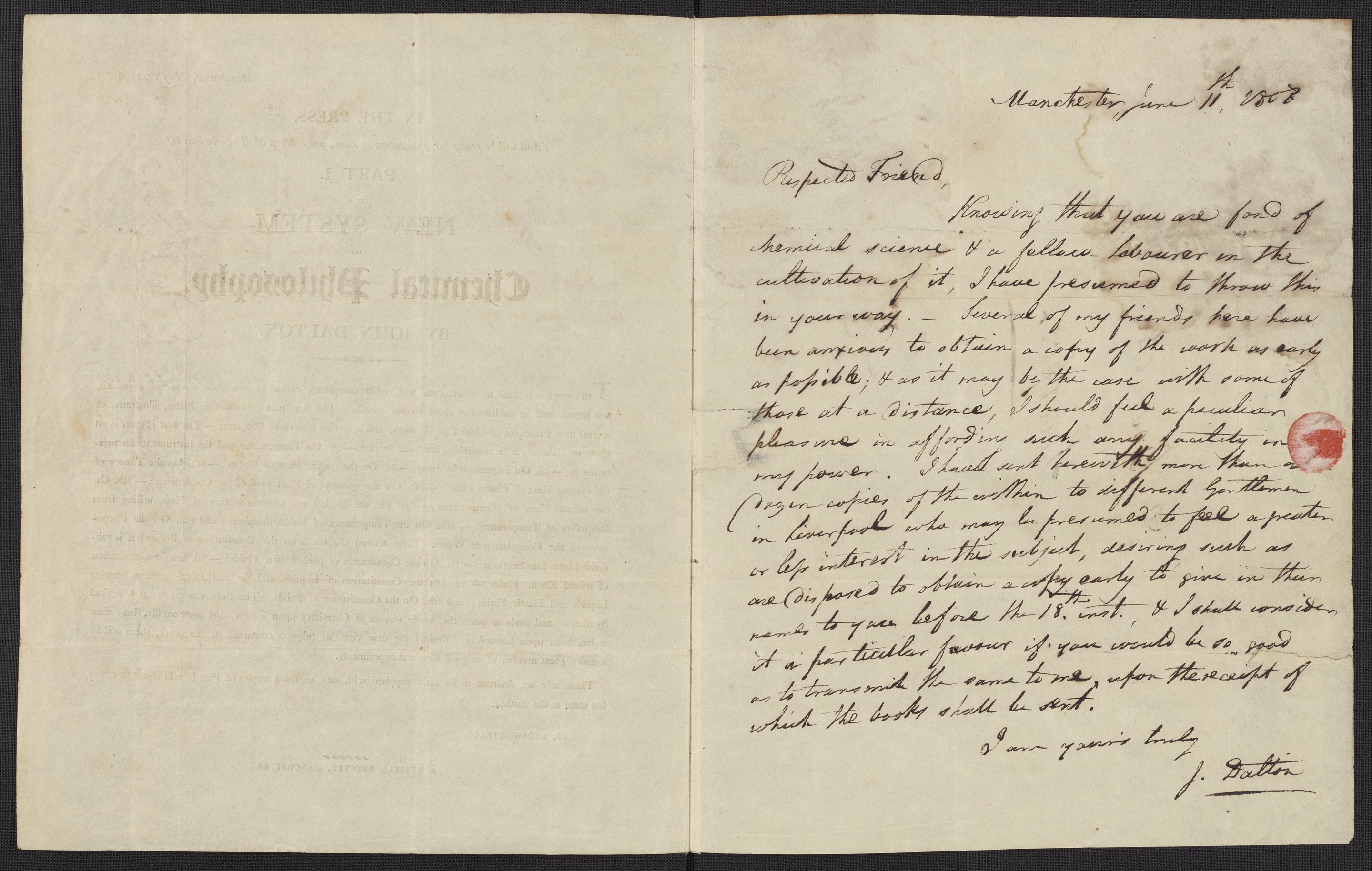 Small JPG1200 x 1477px — 306 KBLarge JPG2880 x 3544px — 1.8 MBFull-sized JPG5063 x 6231px — 5.2 MBOriginal fileTIFF — 5063 x 6231px — 90.3 MBProspectus announcing the publication of part I of John Dalton’s (1766-1844) immortal New System of Chemical Philosophy (Manchester, 1808). This copy contains an accompanying letter to Dr. John Bostock (1773-1846) from Dalton, who enquires if Bostock wishes to purchase a copy of his forthcoming book.