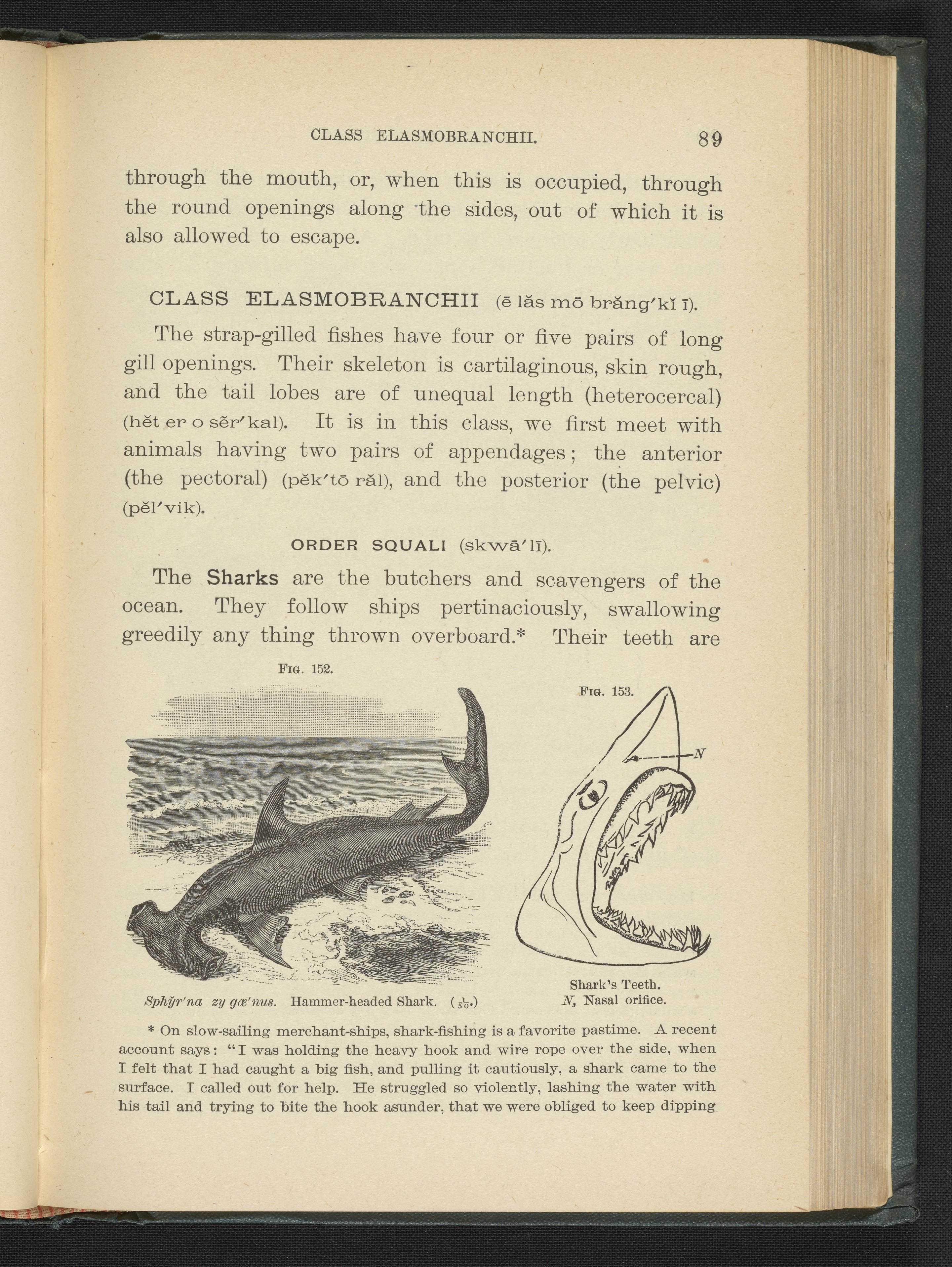 Figures 152 and 153 of the 1887 volume Popular Zoology. Figure 152 depicts a hammerhead shark. Figure 153 depicts a detail view of shark's teeth.