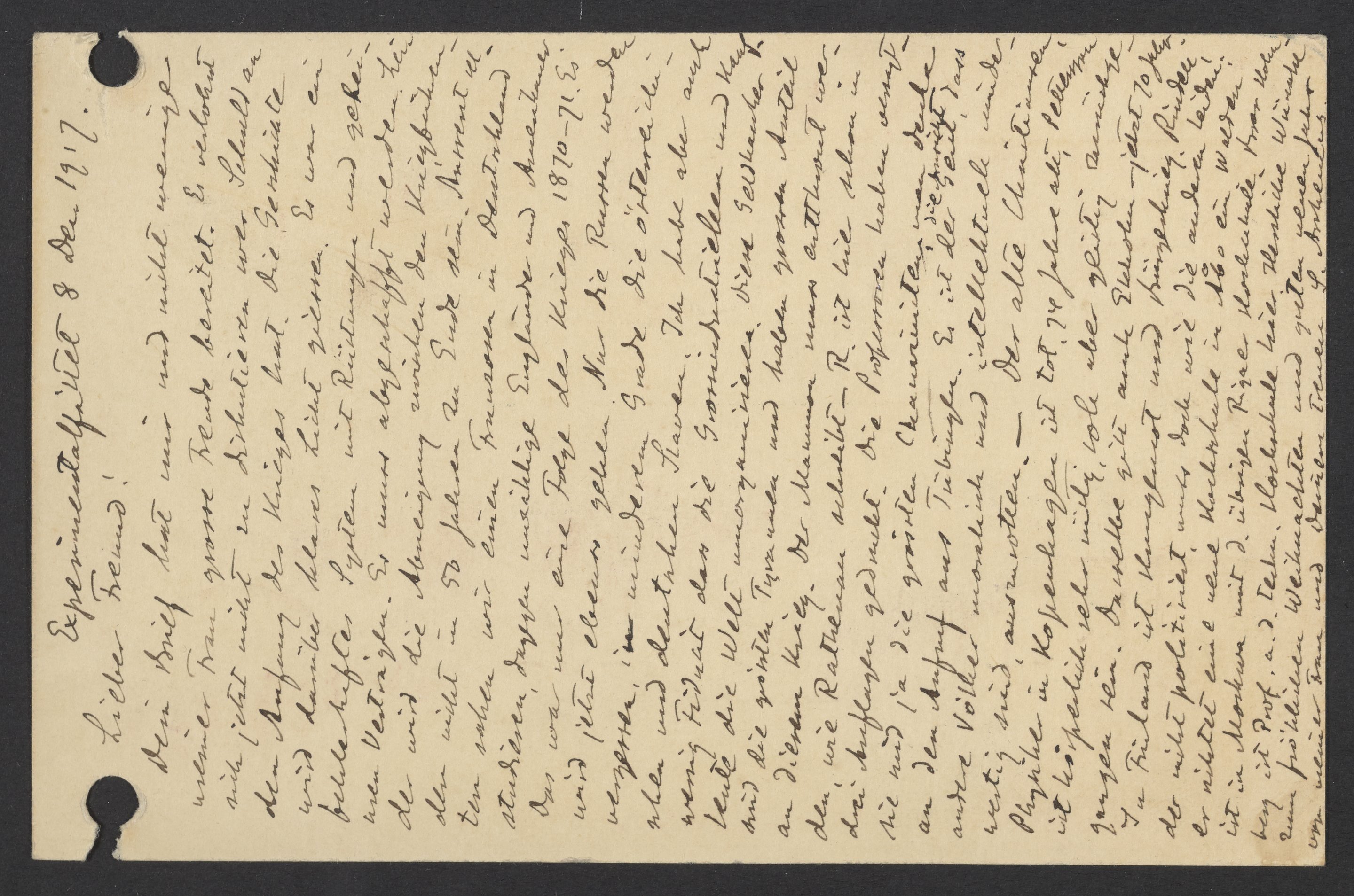 Dein Brief hat mir und nicht weniger meiner Frau grosse Freude bereitet. Es verlohnt sich jetzt nicht zu diskutieren wer Schuld an dem Anfang des Krieges hat. Die Geschichte wird darüber klares Licht giessen. Es war ein fehlerhaftes System mit Rüstungen und geheimen Verträgen. Es muss abgeschafft werden. Leider wird die Abneigung zwischen den Kriegsführenden nicht in 50 Jahren zu Ende sein. Aüsserst selten sahen wir einen Franzosen in Deutschland studieren, dagegen unzählige Engländer und Amerikaner. Das war uns eine Folge des Krieges 1870-71. Es wird jetzt ebenso gehen. Nur die Russen werden verzerren, in niederem Grade die österreichischen und deutsch Slaven. Ich habe aber auch wenig Fidant, dass die Grossindustriellen und Kaufleute die Welt umorganisieren. Diese Geldmacher sind die grössten Tyrannen und haben grossen Anteil an diesem Krieg. Der Mammon muss entthront werden, wie Rathenau schreibt. R ist hier schon in drei Anflugen gedruckt. Die Professoren haben versagt. Sie sind ja die grössten Chanceneinrichter, man denke an den Aufruf aus Tübingen. Es ist ^die Ansicht^ der Geist, dass andere Völker moralisch und intellektuell minderwertig sind, auszurotten. Der alte Christiansen, Physiker in Kopenhagen, ist tot, 74 Jahre alt. Pettersson ist sehr züchtig, soll aber geistig zurückgegangen sein. Dasselbe geht auch Ekholm – jetzt 70 Jahre. In Finnland ist Hungernot und Bürgerkrieg. Rindell, der nicht politisiert, muss doch wie die anderen leiden! Er richtet eine kleine Hochschule in Åbo ein. Walden ist in Moskau mit d. übrigen Rigaer Hochschule. Herr Holmberg ist Prof. a.d. Tech. Hochschule hier. Herzliche Wünsche zum fröhlichen Weihnachten und guten neuen Jahr von meiner Frau und Deinem treuen S. Arrhenius