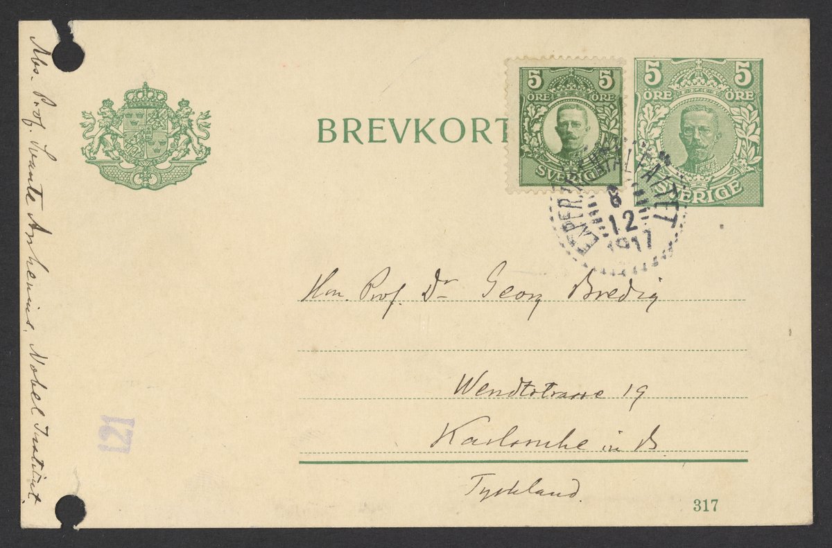 Postcard from Svante Arrhenius to Georg Bredig, December 1917