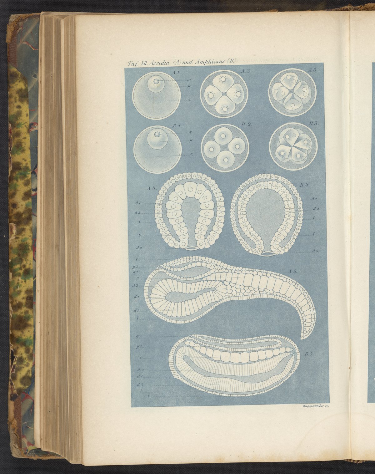 Haeckel, Ernst. “Plate XII: Ascidia and Amphioxus.” Natürliche Schöpfungsgeschichte: Gemeinverständliche Wissenschaftliche Vorträge Über Die Entwickelungslehre. Berlin, Germany: G. Reimer, 1872. https://digital.sciencehistory.org/works/8s3txc0.