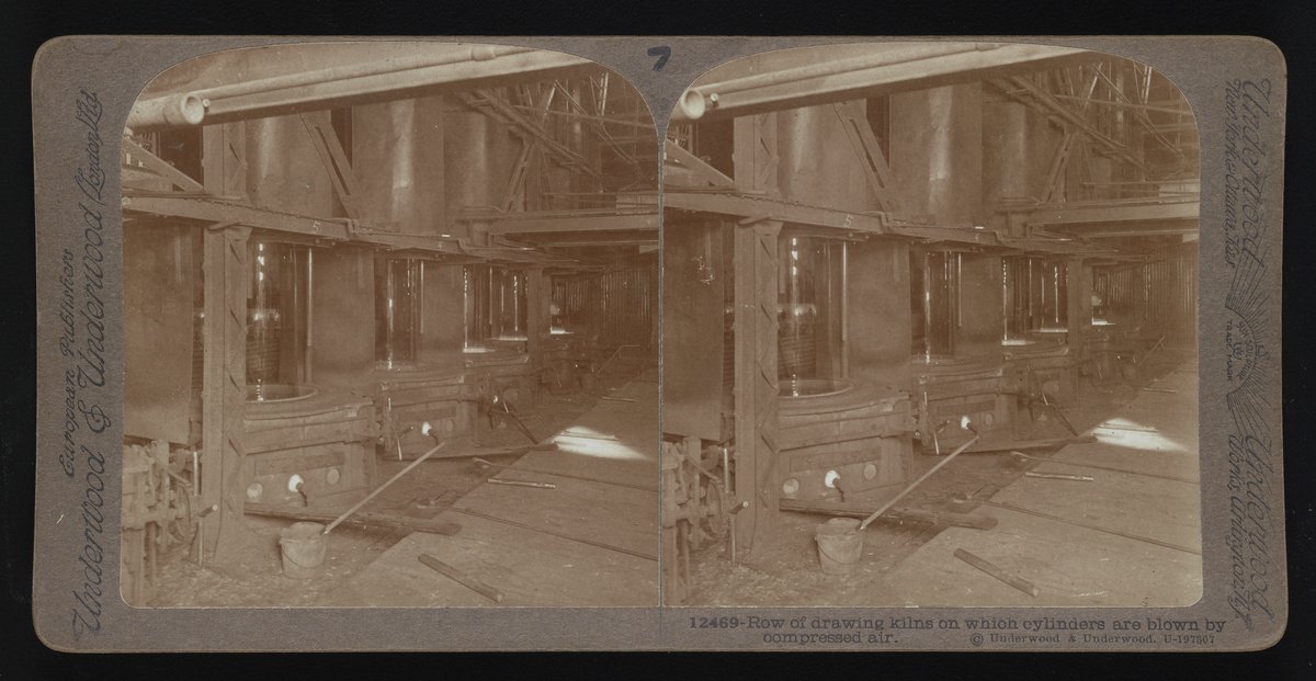 “Row of Drawing Kilns on Which Cylinders Are Blown by Compressed Air.” Underwood & Underwood, n.d. Underwood & Underwood Stereographs of Manufacturing Industries. Science History Institute. Philadelphia. https://digital.sciencehistory.org/works/8s45q8784.