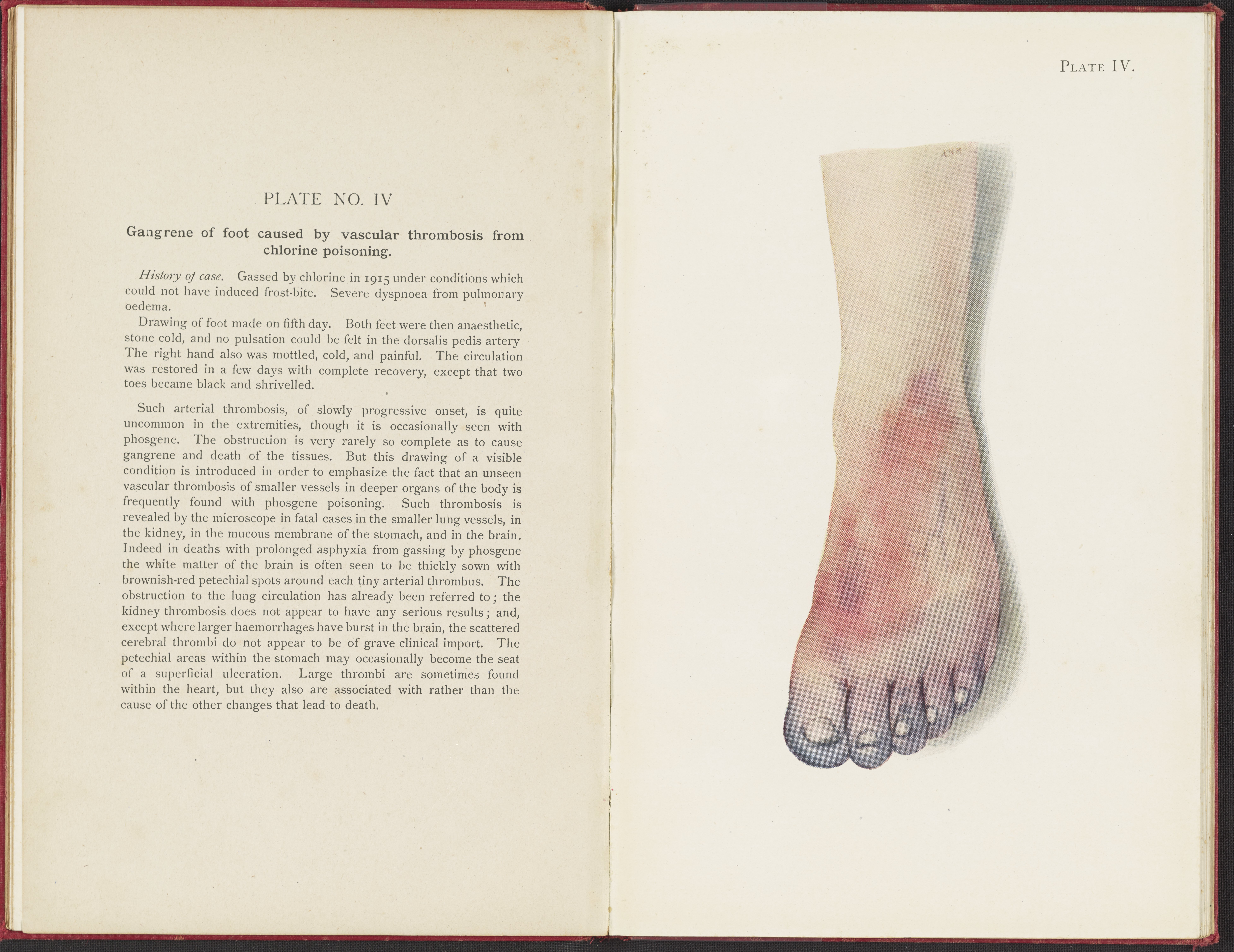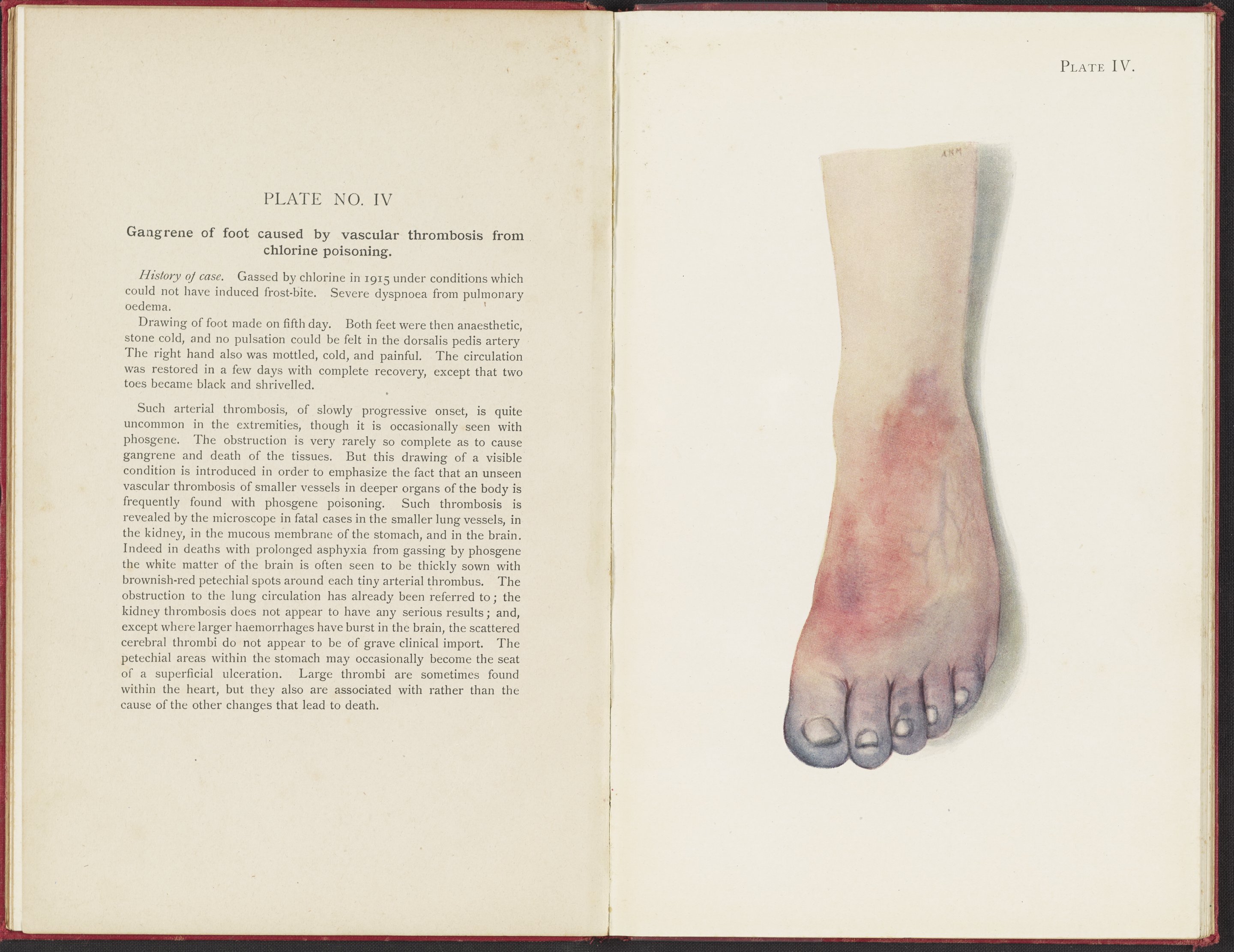 Great Britain. Medical Research Committee. “Plate IV. Gangrene of Foot Caused by Vascular Thrombosis from Chlorine Poisoning.” An Atlas of Gas Poisoning. London, England, 1918. https://digital.sciencehistory.org/works/8s45q881f.