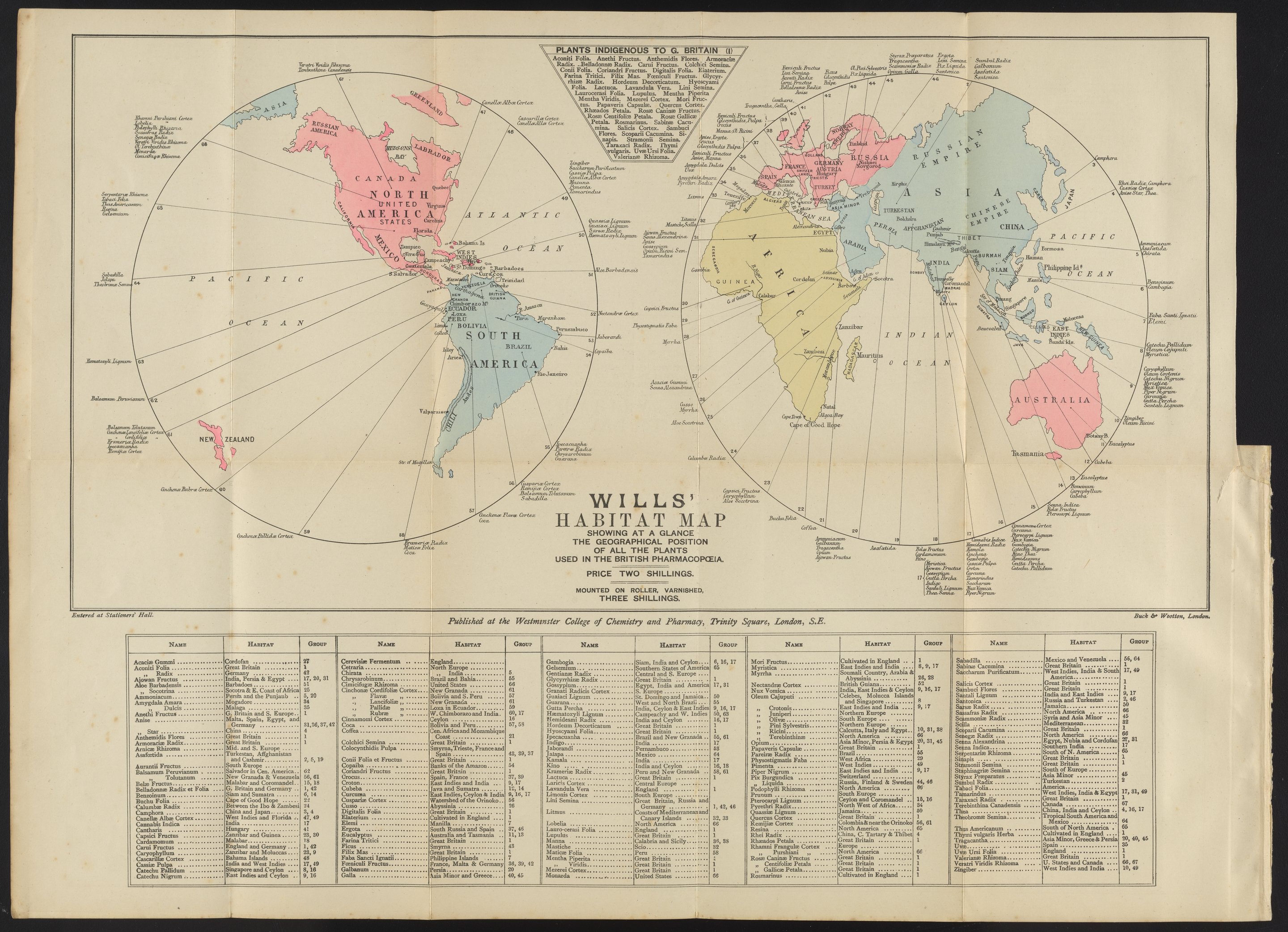 Foldout map of the geographical habitat of all the plants used in the British Pharmacopoeia. Includes list of plants indigenous to Great Britain.