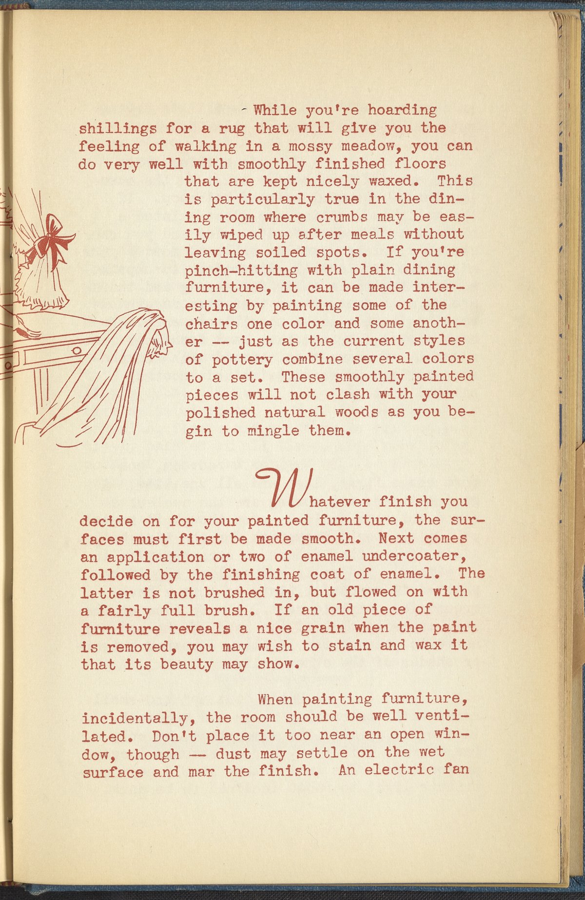 Booklet corresponding to a radio broadcast program created by the National Paint, Varnish, and Lacquer Association. The booklet explains how a fresh coat of paint can be the ultimate way to update a home during spring cleaning. Discusses paint and varnish uses including lacquering linoleum flooring, adding a gloss coat to walls and ceilings, and finishing painted furniture. Includes small stylized illustrations throughout and decorated covers.