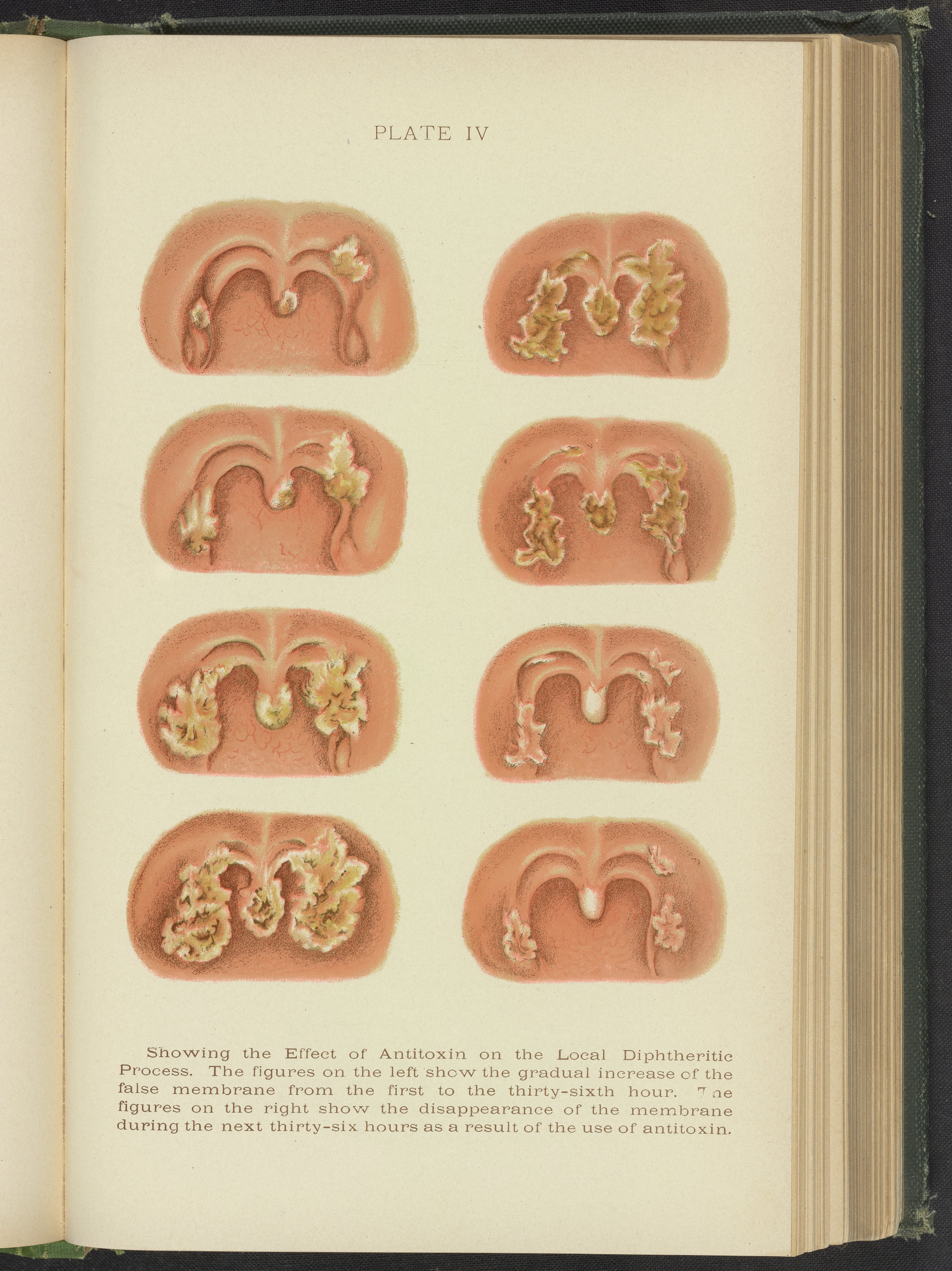 Plate IV depicting the effect of antitoxin on the local diphtheritic process with description underneath the plate as follows: