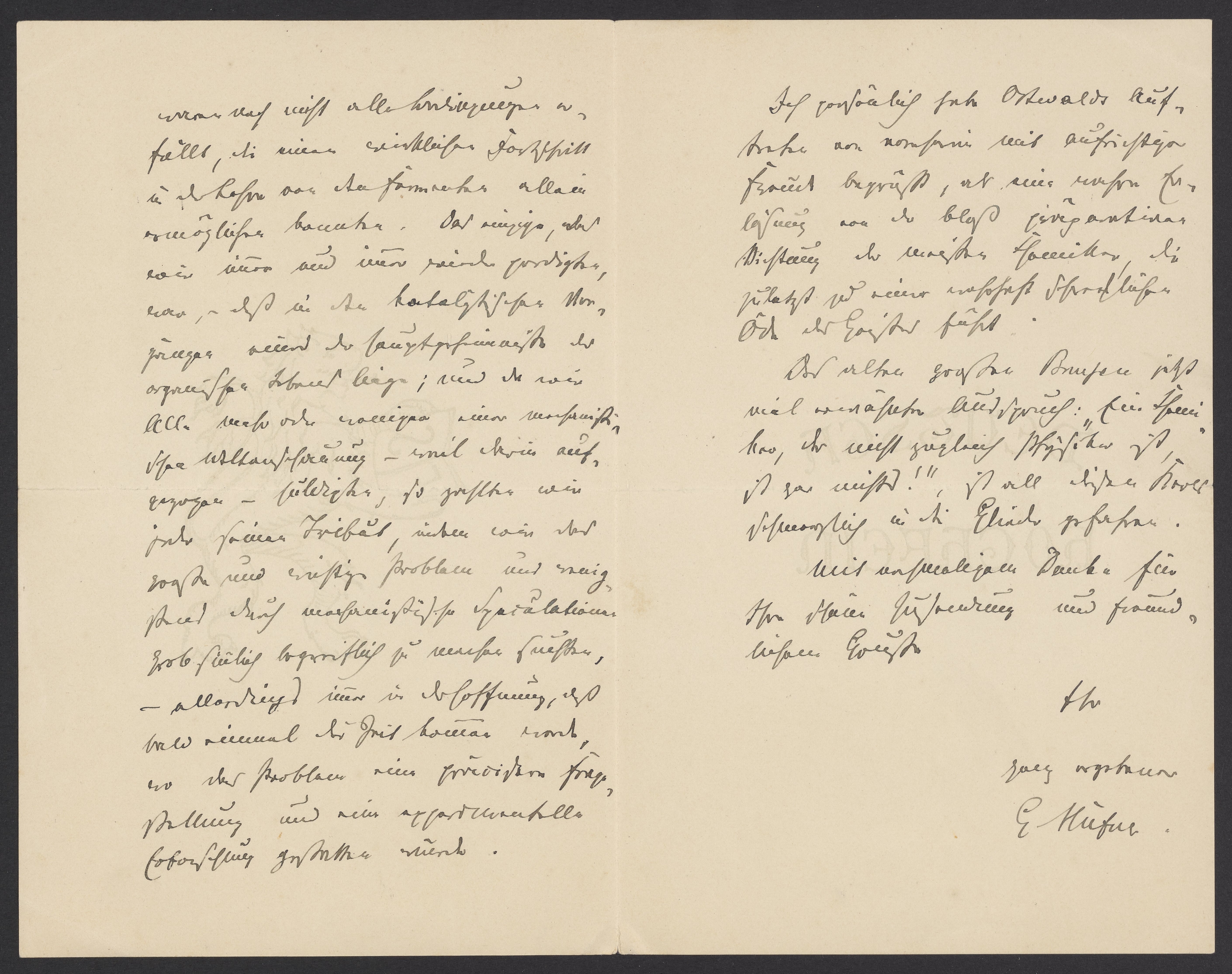 Ich persönlich habe Ostwalds Auftreten von vornherein mit aufrichtiger Freude begrüßt, als eine wahre Erlösung von der bloß arroganten Mitteilung der meisten Chemiker, die zuletzt zu einer erfolgten Sträflichkeit der Egoisten führt.