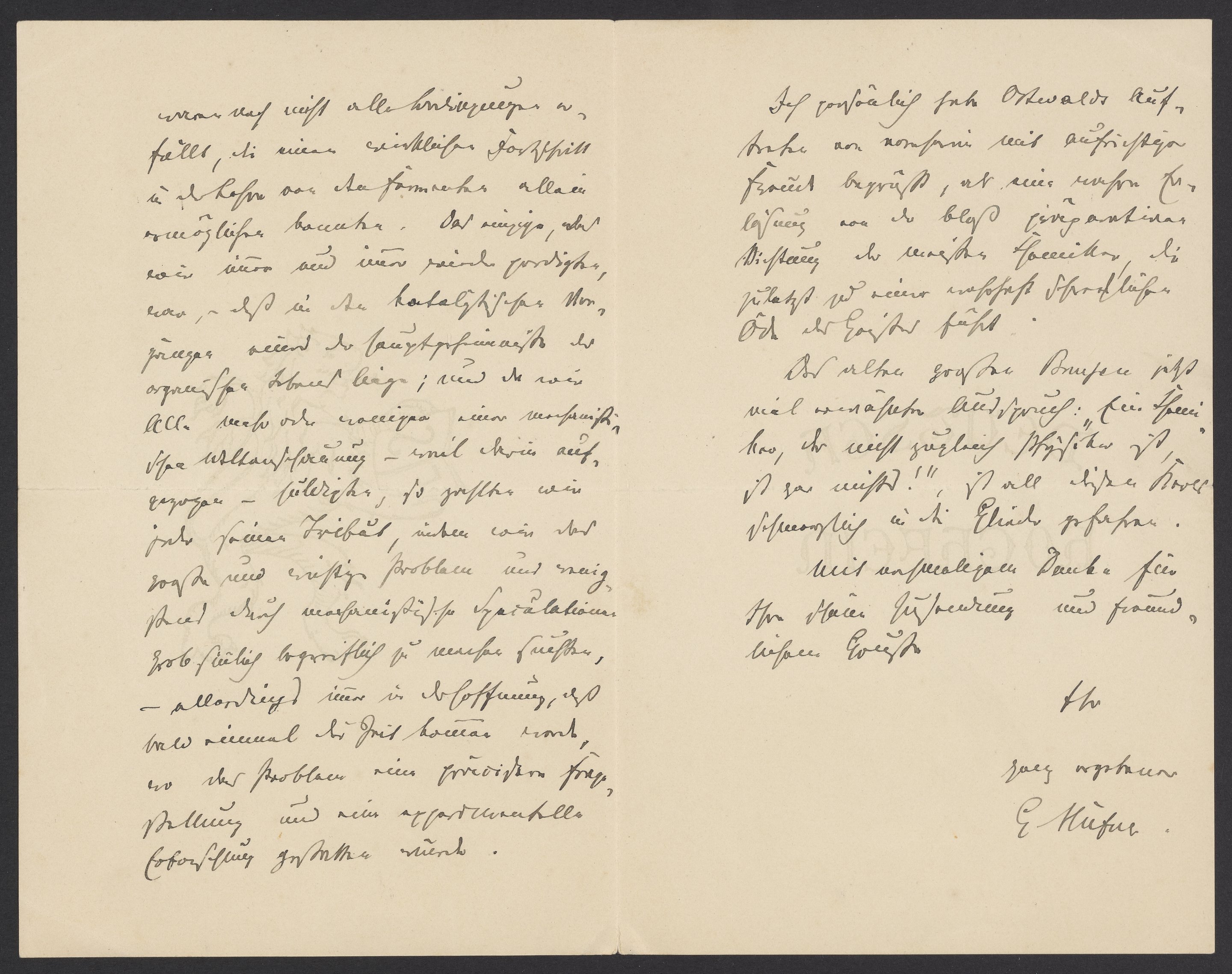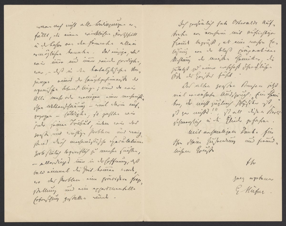 Erst jetzt unter Freude bin ich dazu gekommen, Ihre Abhandlung über anorganische Fermente mit Aufmerksamkeit zu studieren und nun kann ich es mir nicht entsagen, Sie zu den schönen Abhandlungen, die Sie eben veröffentlicht und die mannigfachen interessanten Betrachtungen, die Sie angestellt haben, zu beglückwünschen. Die meisten wissenschaftlichen Forschungen über Katalyse erscheint mir als Physiologen als die Erfüllung eines Zugeständnisses. Aber es hat eben Alles seine Zeit. In früheren Jahren, auch im Anfang der Siebziger des vorigen Jahrhunderts