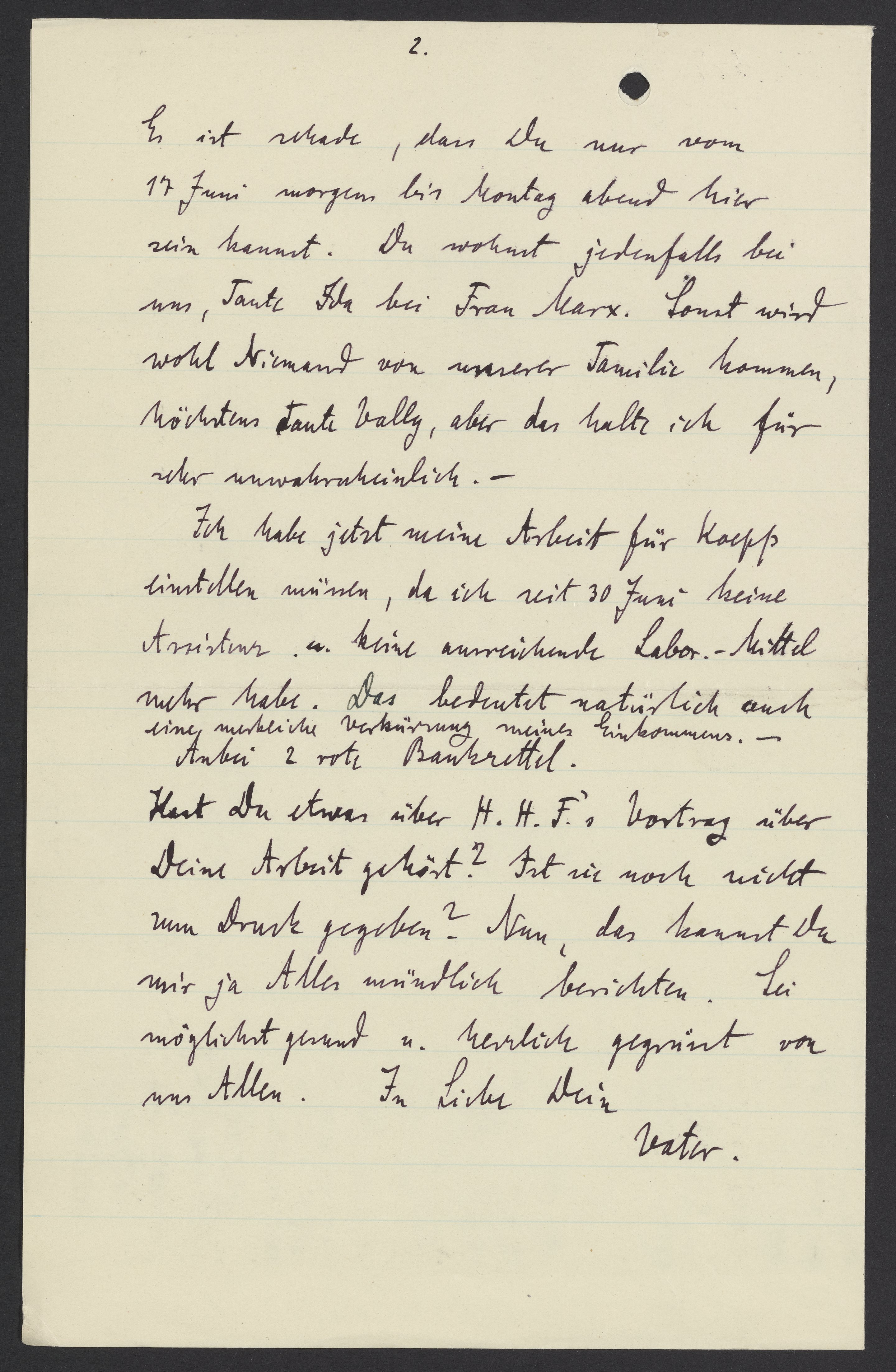 Hast Du etwas über H.H.F’s Vortrag über Deine Arbeit gehört? Ist sie noch nicht zum Druck gegangen? Nun, das kannst Du mir ja alles mündlich berichten. Sei möglichst gesund u. herzlich gegrüsst von uns allen. In Liebe Dein Vater