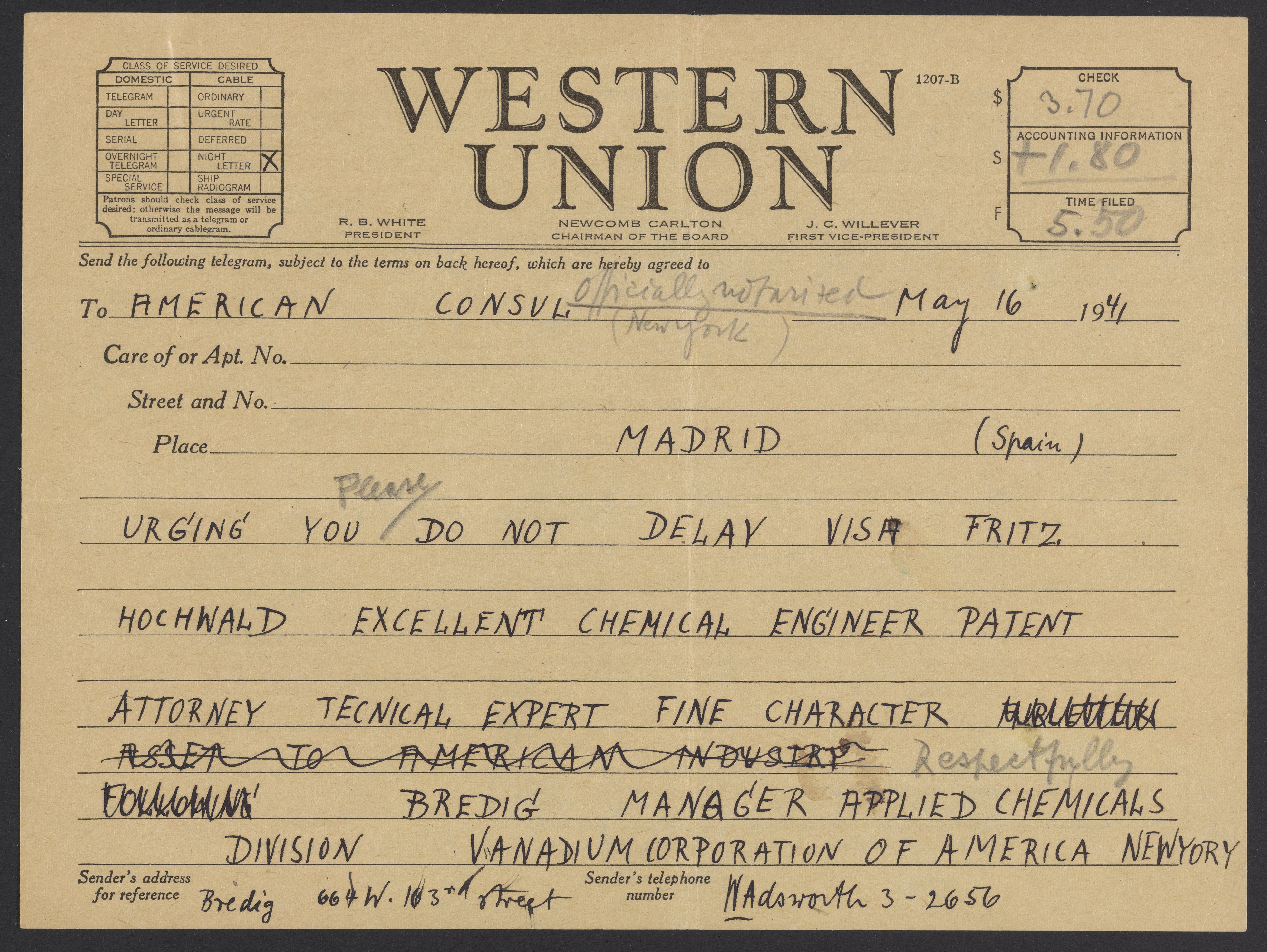 Telegram from Max Bredig to the American Consul, May 16, 1941