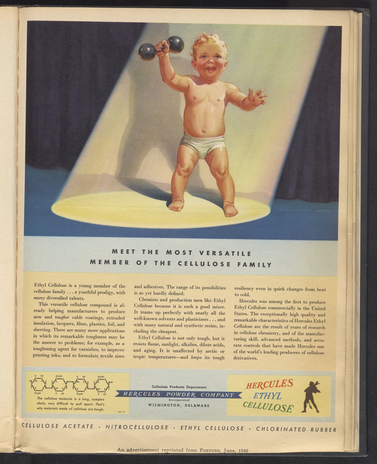 Advertisement for Ethyl Cellulose manufactured and sold by the Hercules Powder Company for use as a toughening agent in cable coatings, lacquers, films, plastics, and varnishes, among other applications. The advertisement features a baby standing in a spotlight holding a dumbbell, an image intended to underscore the toughness and resiliency of Hercules Ethyl Cellulose relative to its newness. This advertisement appeared in the June 1940 edition of Fortune magazine.