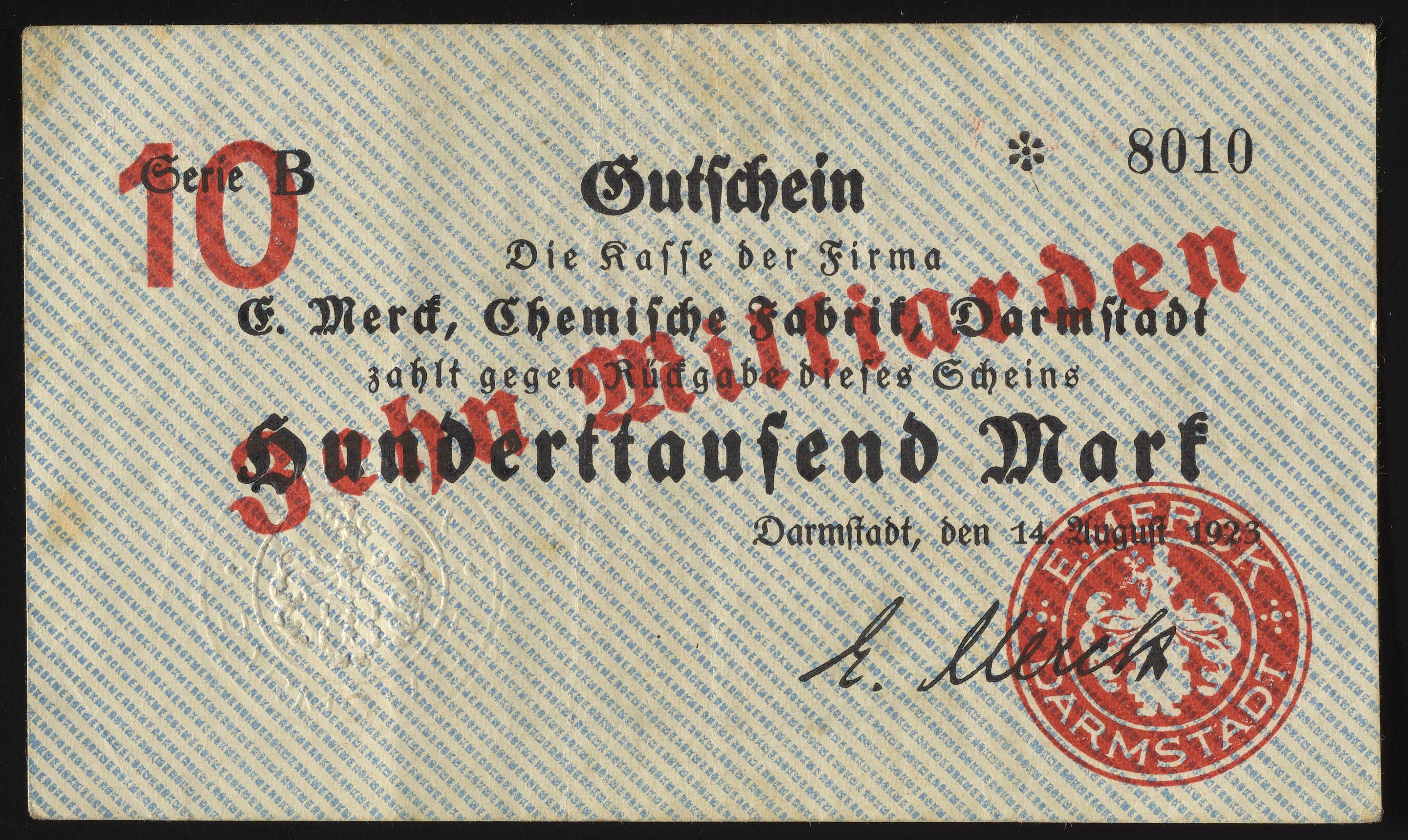 “E. Merck Zehn Milliarden/Hunderttausend Mark Gutschein.” Darmstadt, Germany: E. Merck (Firm), August 14, 1923. Robert J. Bauman collection. Science History Institute. Philadelphia. https://digital.sciencehistory.org/works/9593tv99z.