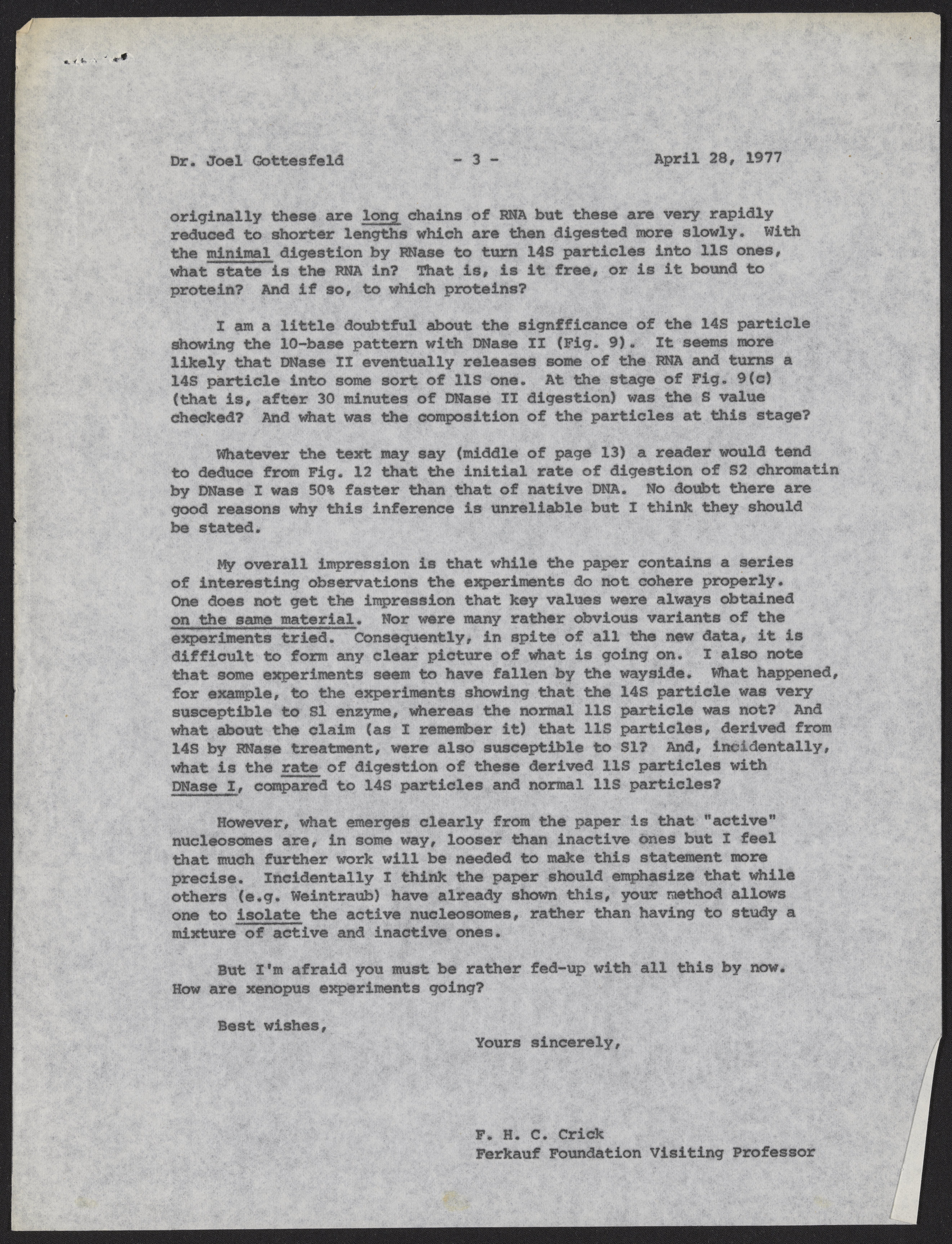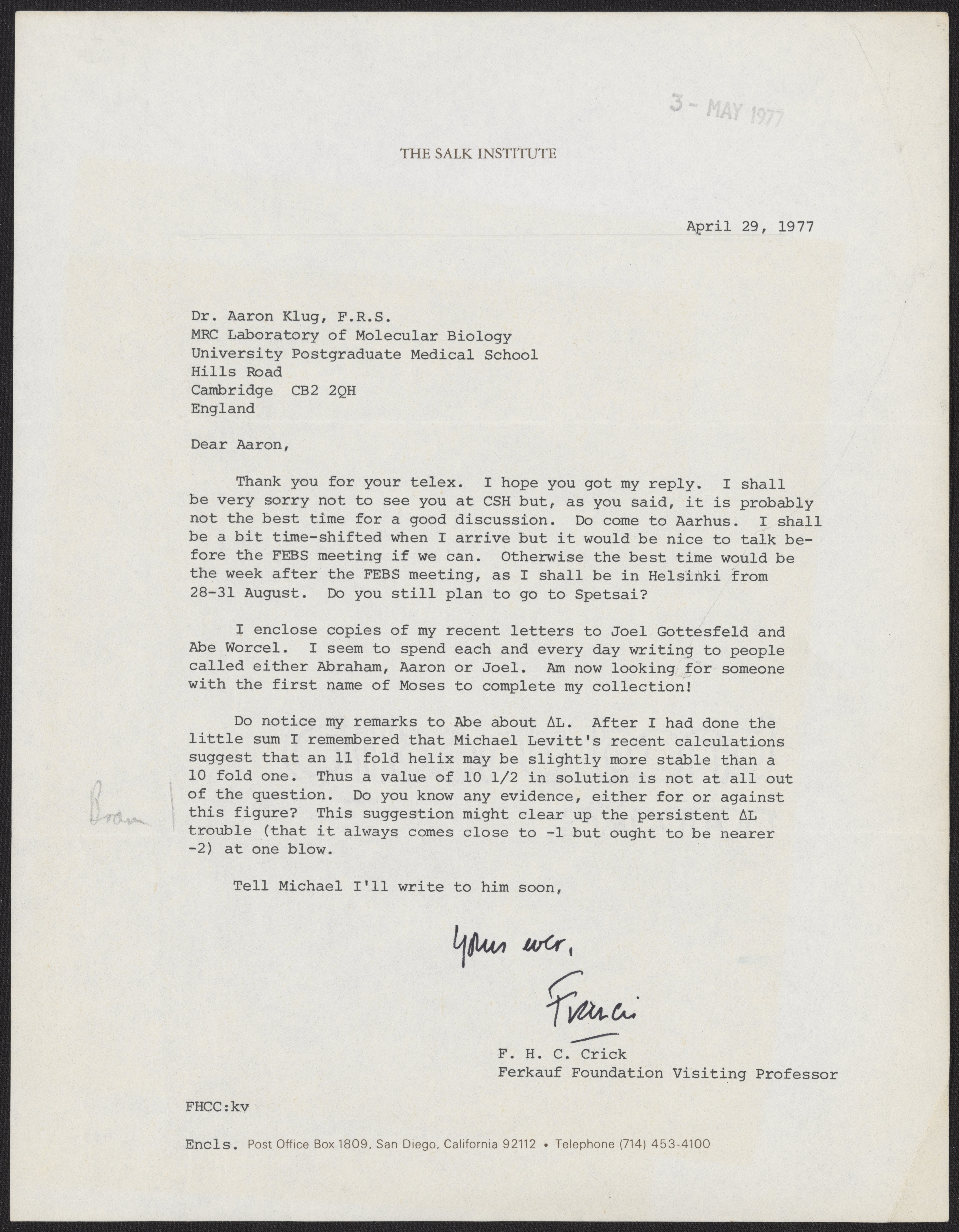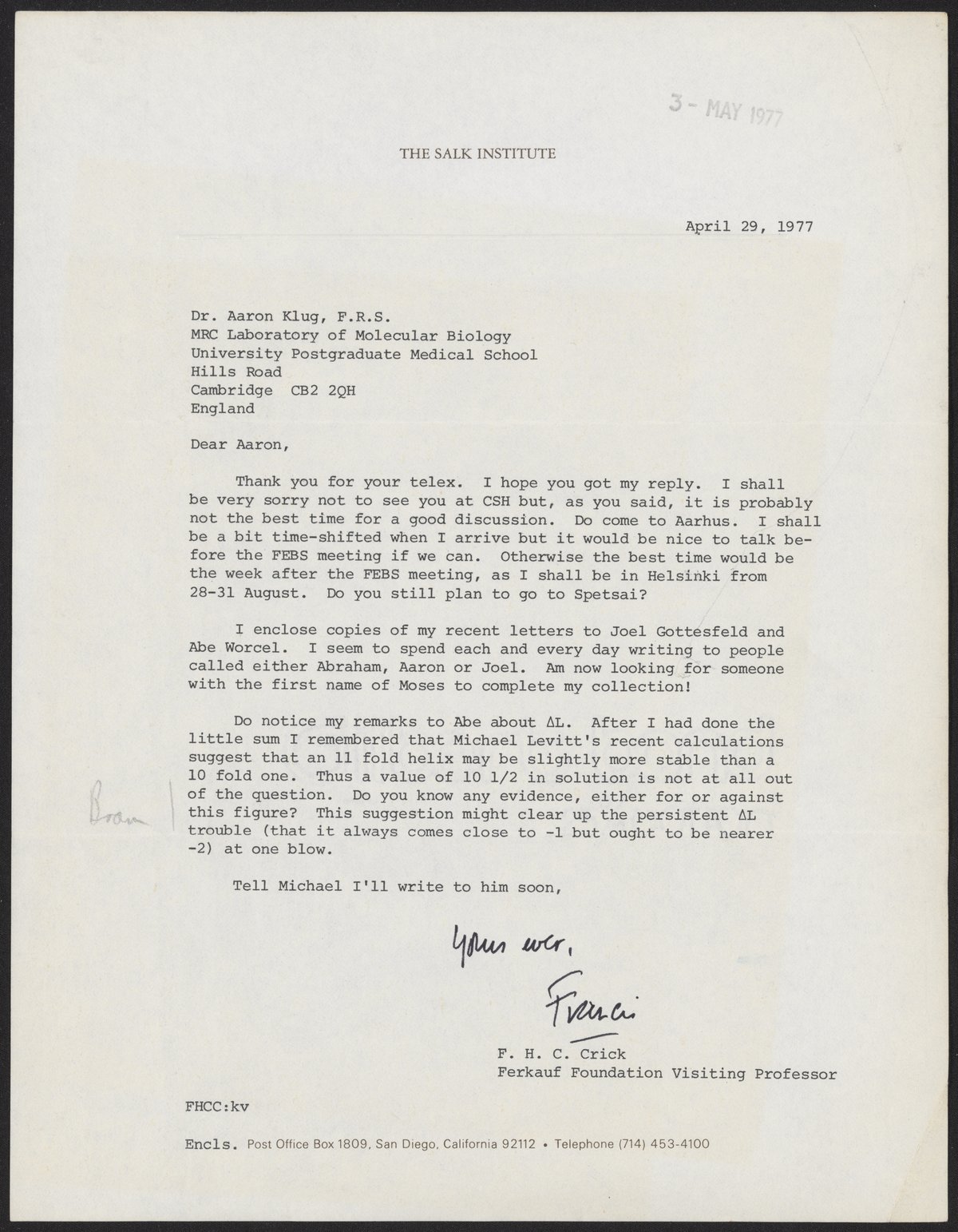 Crick, Francis. “Letter from Francis Crick to Aaron Klug, April 29, 1977,” April 29, 1977. History of Molecular Biology Collection, Box 20, Folder 1. Science History Institute. Philadelphia. https://digital.sciencehistory.org/works/97qhm3e.