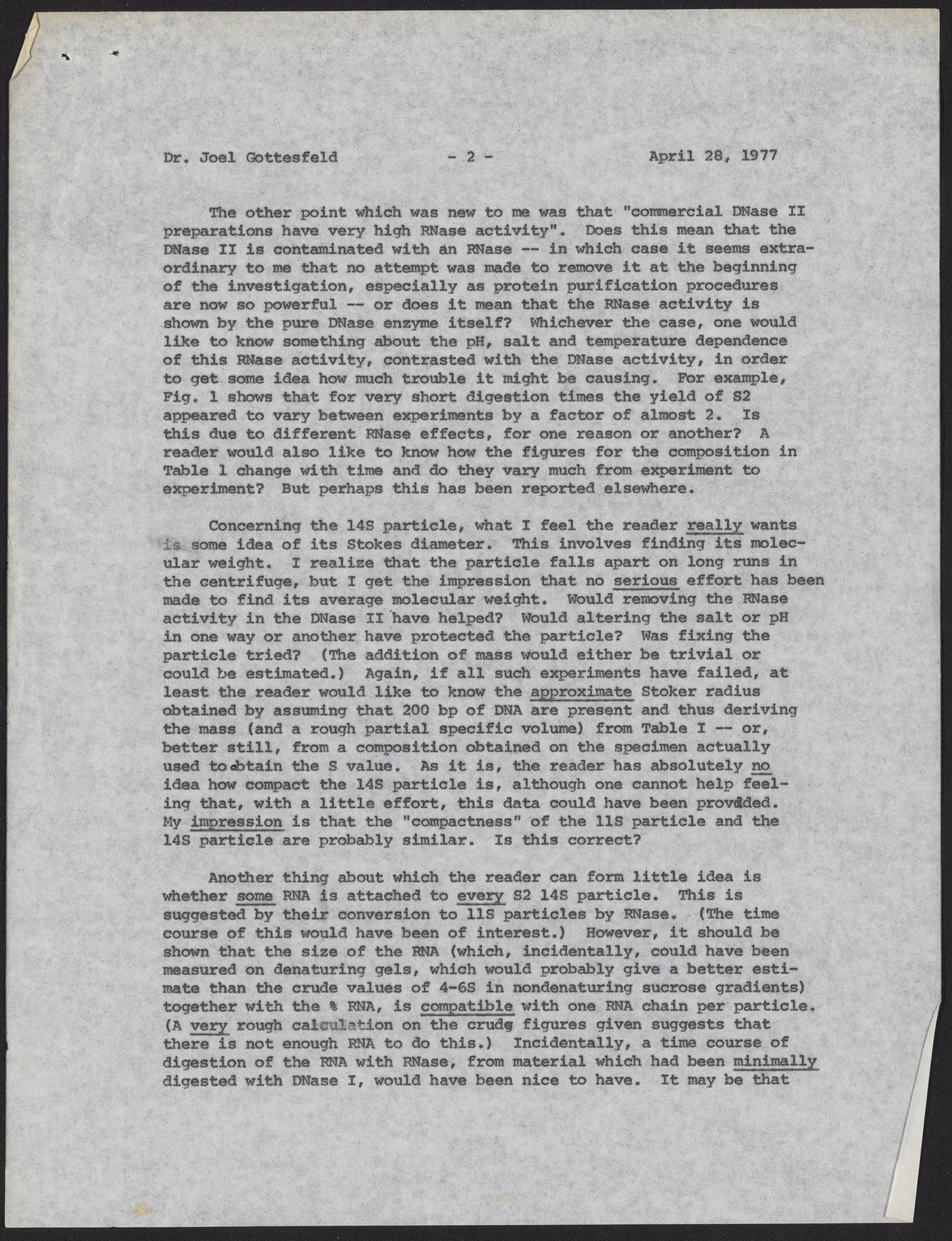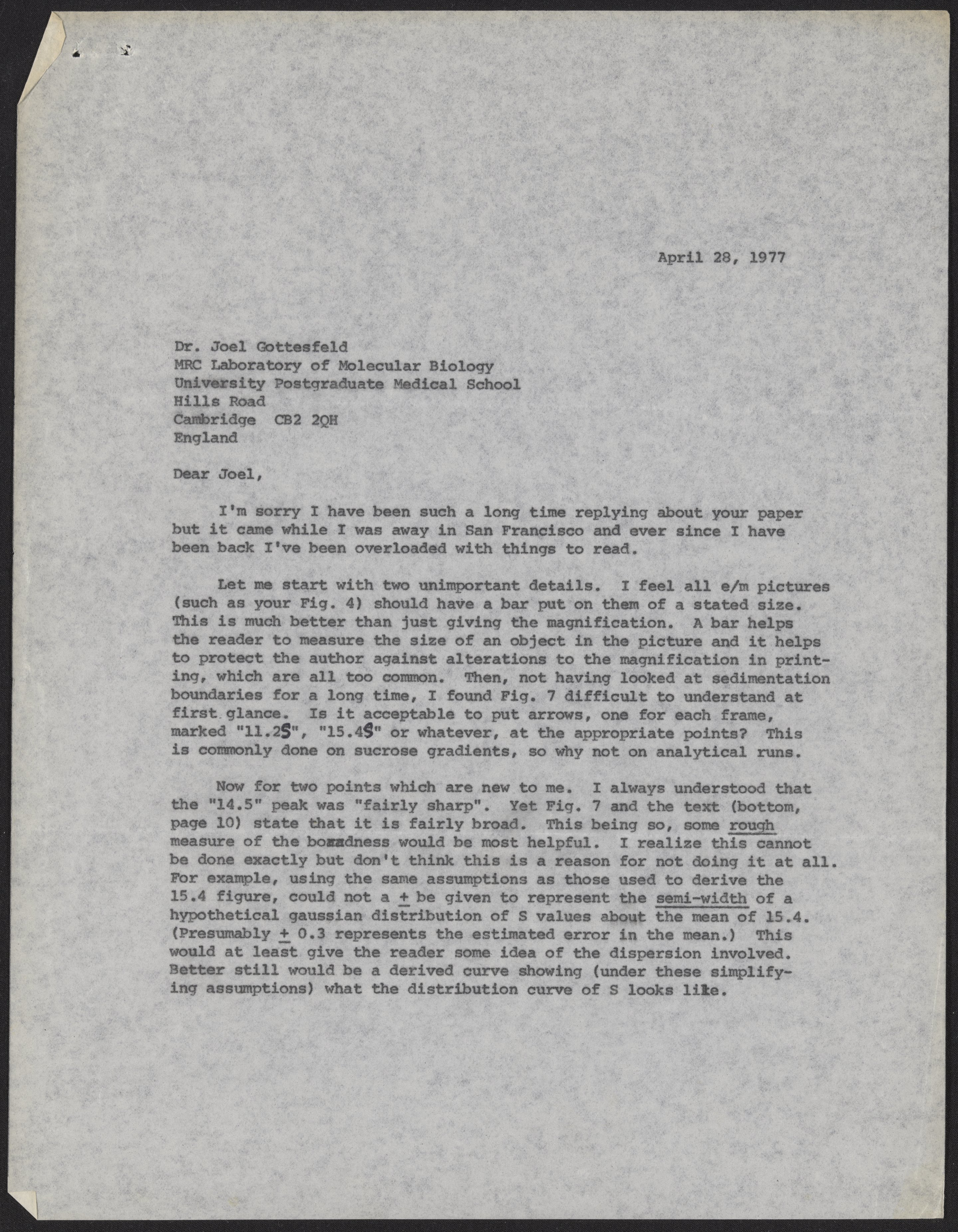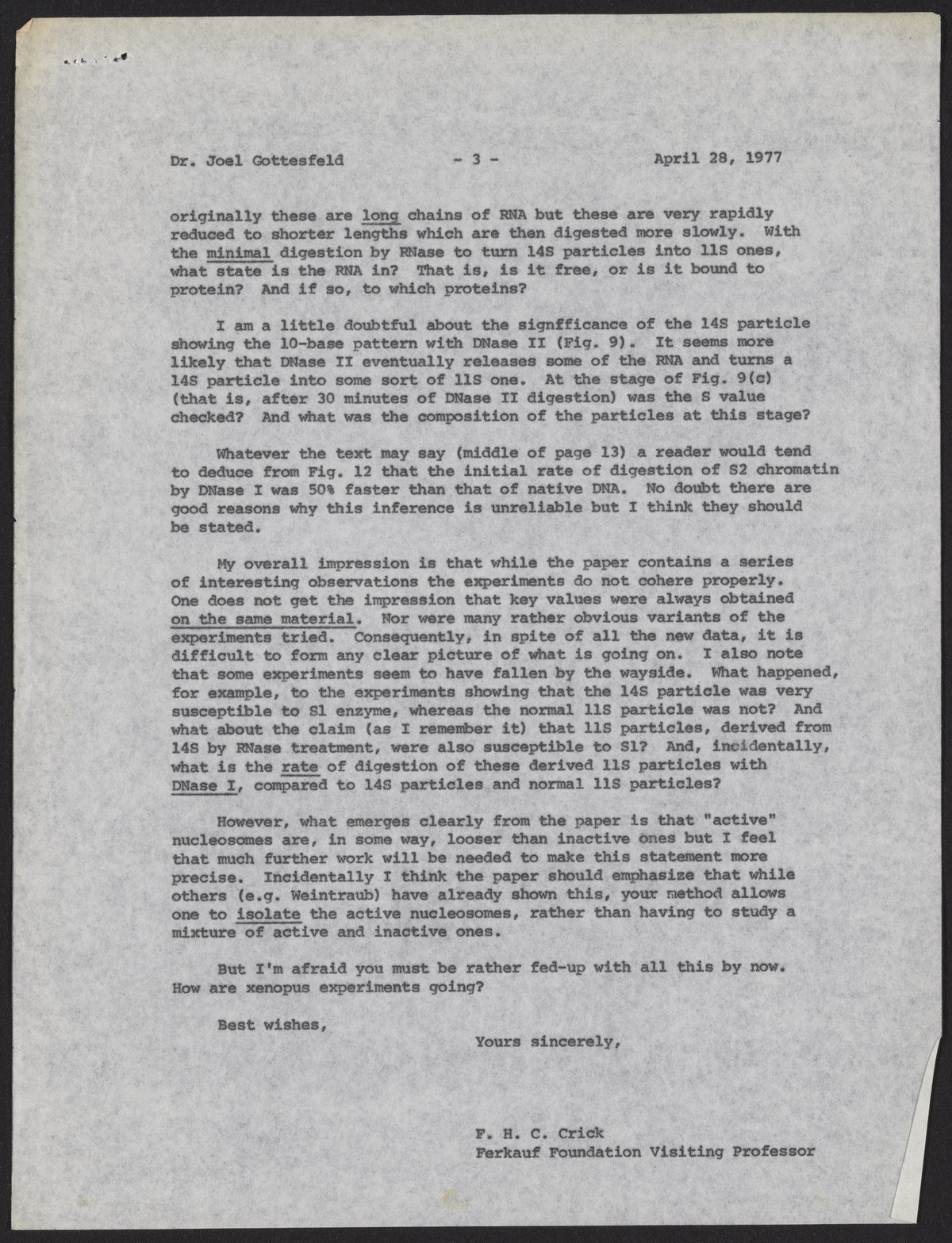 Crick, Francis. “Letter from Francis Crick to Aaron Klug, April 29, 1977,” April 29, 1977. History of Molecular Biology Collection, Box 20, Folder 1. Science History Institute. Philadelphia. https://digital.sciencehistory.org/works/97qhm3e.