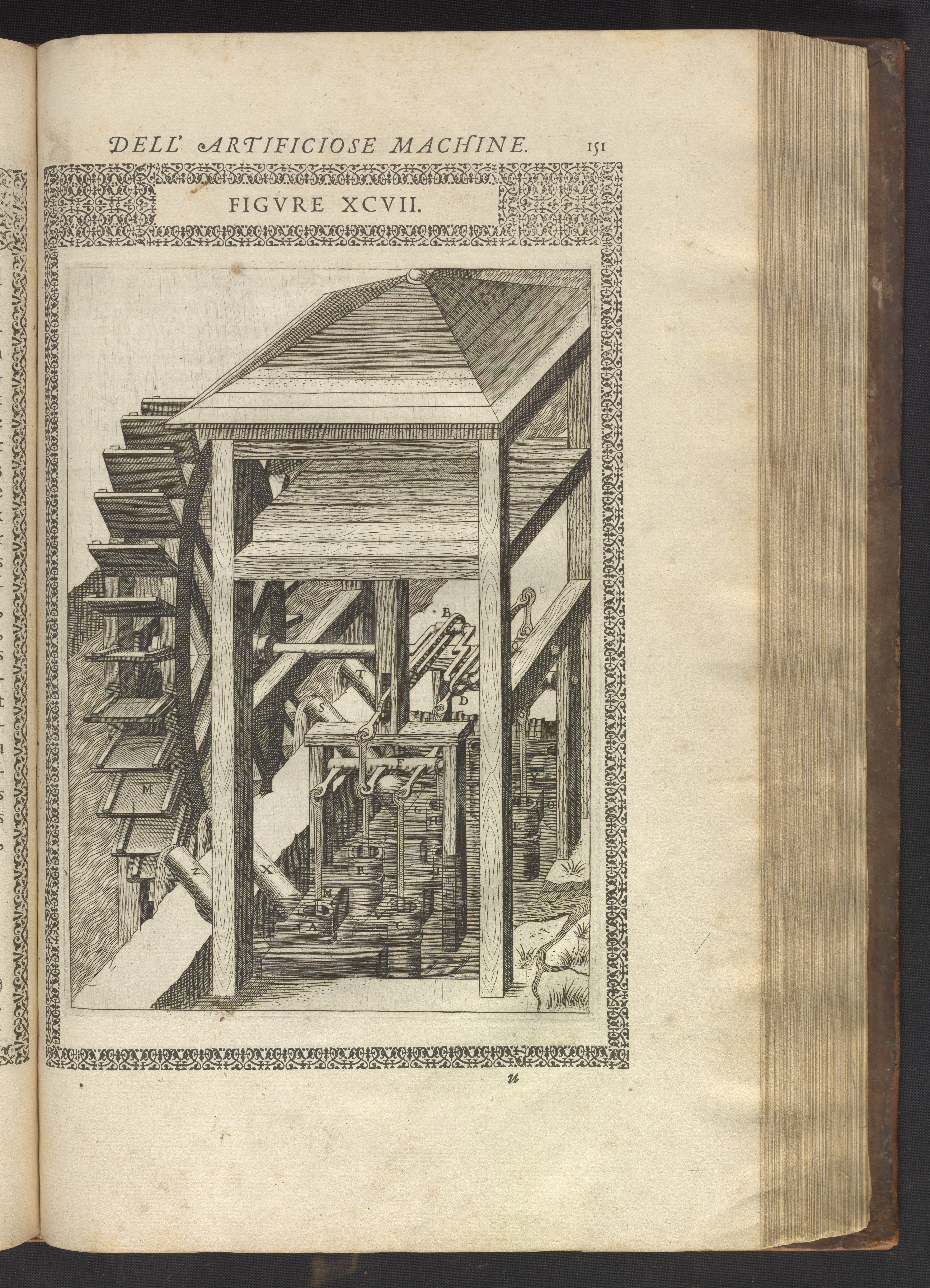 Ramelli, Agostino. “Plate 97: Device for Draining Water from a Marsh, Pool, or Foundation by River Current.” In Le Diverse Et Artificiose Machine Del Capitano Agostino Ramelli. Paris, France, 1588. https://digital.sciencehistory.org/works/9880vr14w.