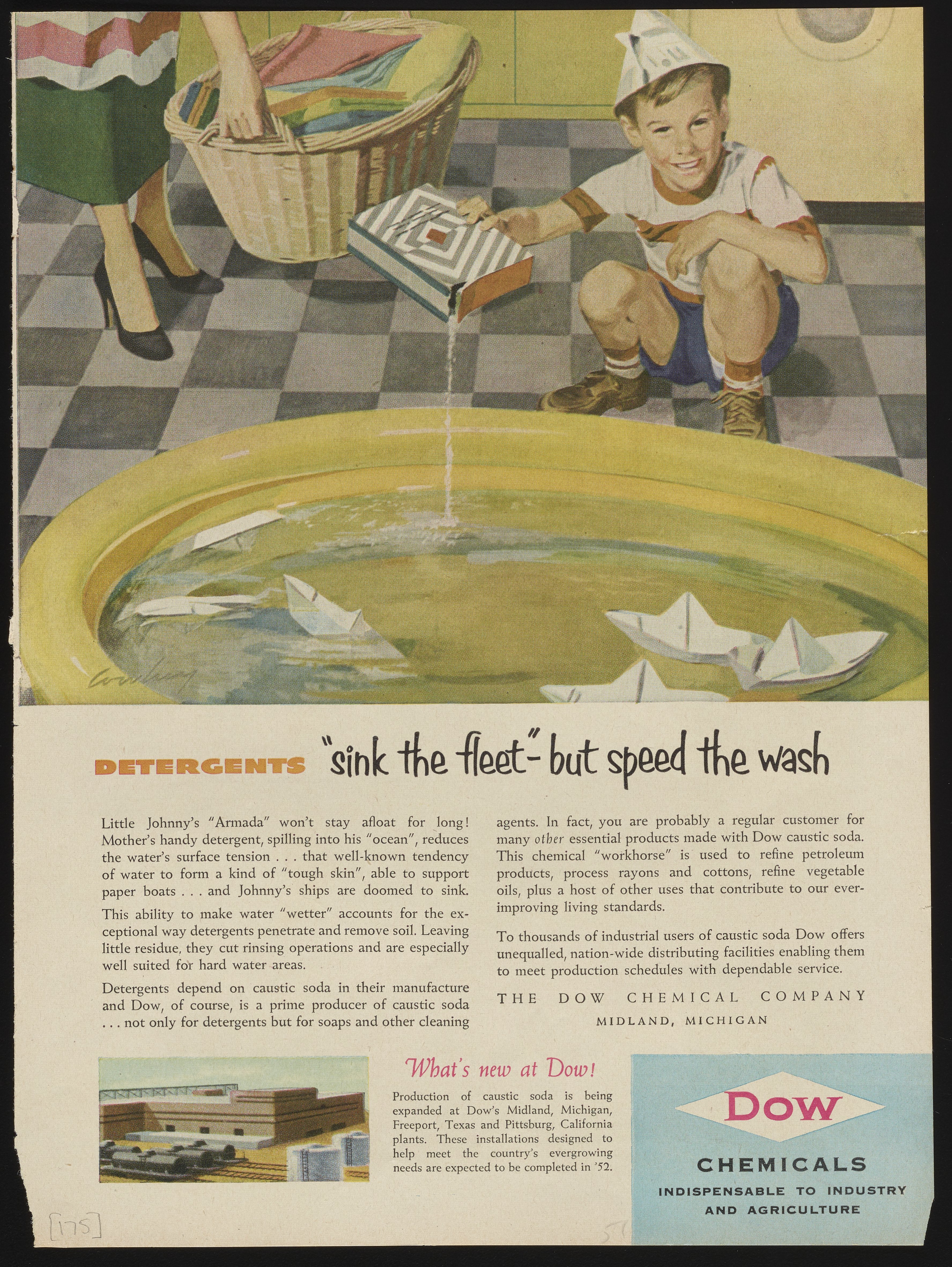 Dow Chemical Company. “Detergents ‘Sink the Fleet’ - But Speed the Wash,” 1951. Advertisements from the Dow Chemical Historical Collection, Box 7. Science History Institute. Philadelphia. https://digital.sciencehistory.org/works/9880vr71h.