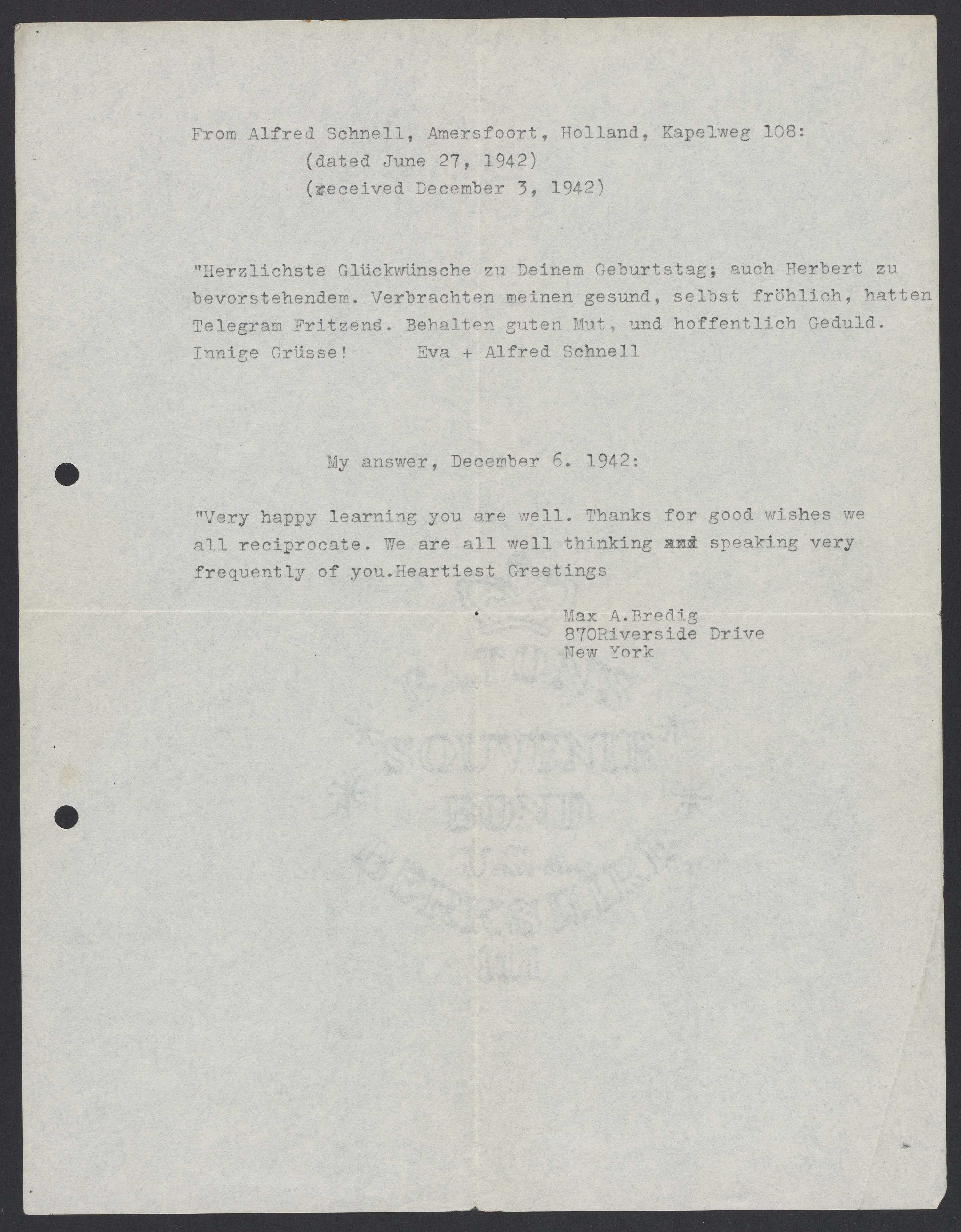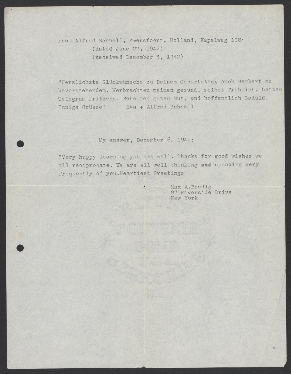 Correspondence between Max Bredig and Alfred and Eva Schnell, December 1942