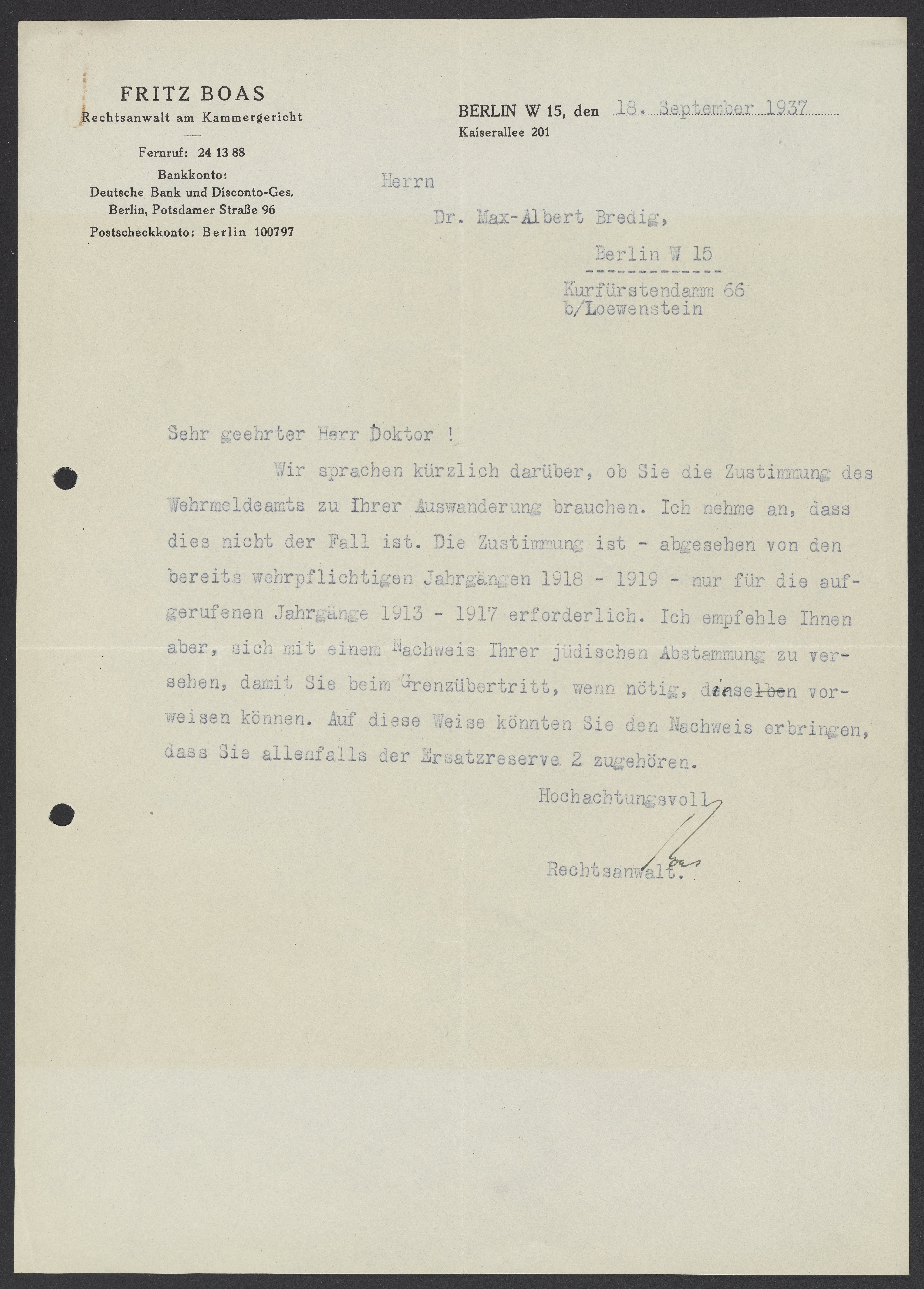 Wir sprachen kürzlich darüber, ob Sie Zustimmung des Wehrmeldeamts zu Ihrer Auswanderung brauchen. Ich nehme an, dass dies nicht der Fall ist. Die Zustimmung ist – abgesehen von den bereits wehrpflichtigen Jahrgängen 1918-1919 – nur für die aufgerufenen Jahrgänge 1913-1917 erforderlich. Ich empfehle Ihnen aber, sich mit einem Ausweis ihrer jüdischen Abstammung zu versehen, damit Sie beim Grenzübertritt, wenn nötig, denselben vorweisen können. Auf diese Weise könnten Sie den Nachweis erbringen, dass Sie allenfalls der Ersatzreserve 2 zugehören.